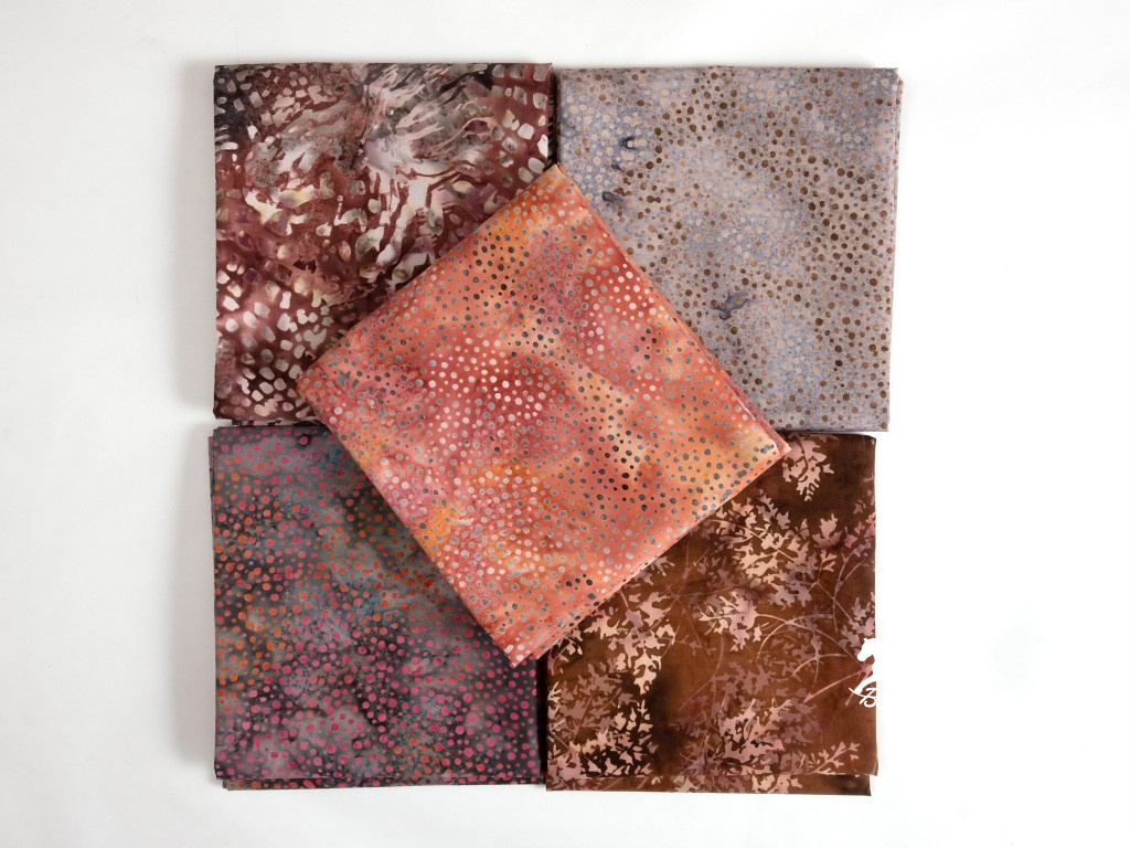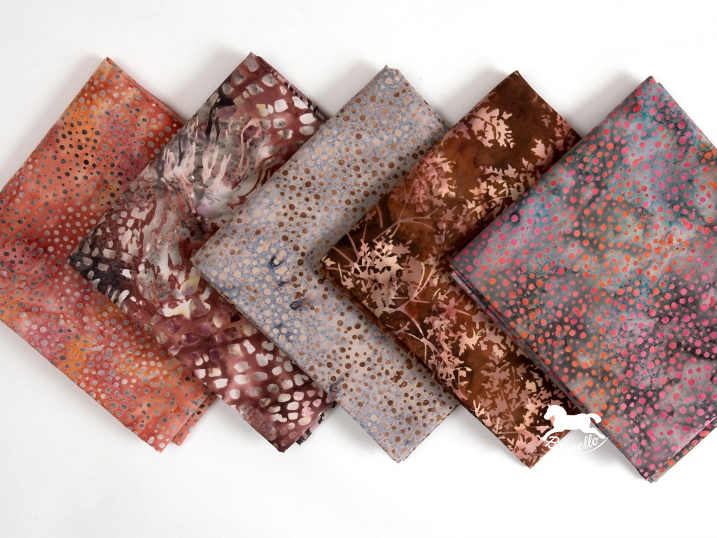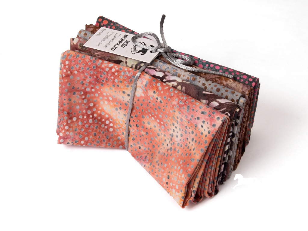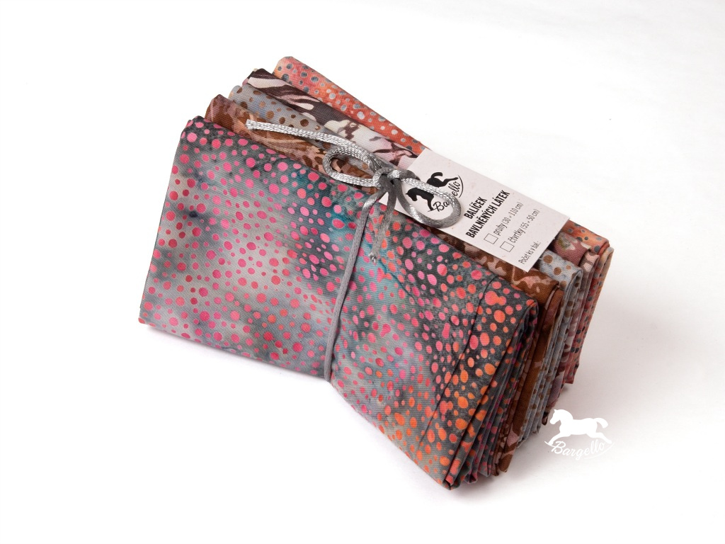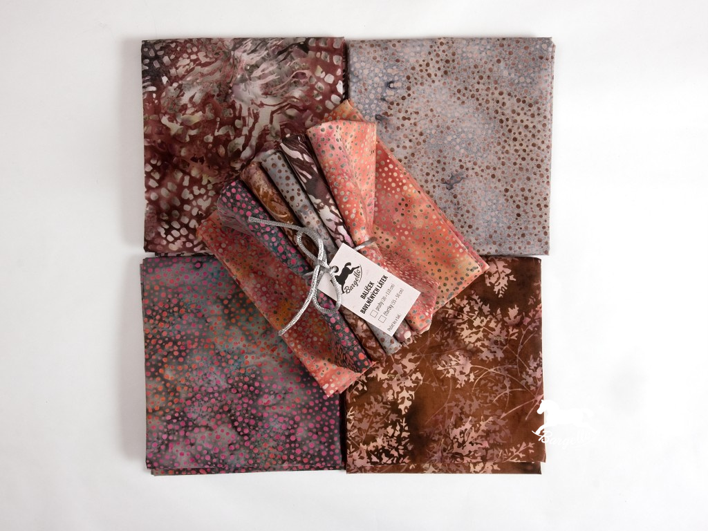 Barevná kombinace zahrnuje dvě šedé čtvrtky Bali Dots s puntíčky, dvě kávově hnědé látky z Bali Handpaints se světlými vzory a jednu výraznější Bali Dots v oranžovo-růžové barvě, která dodává balíčku hravost a svěžest.