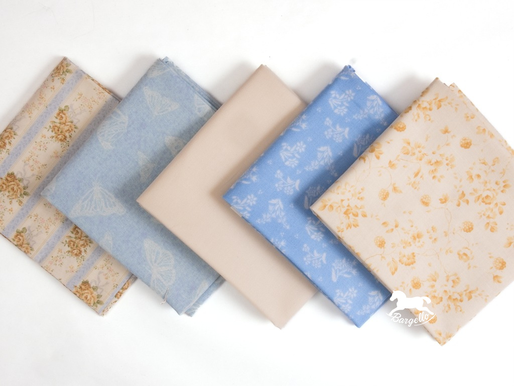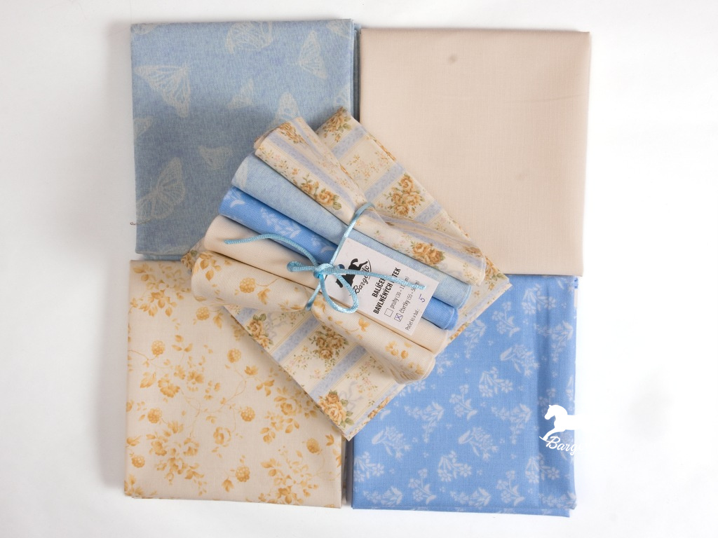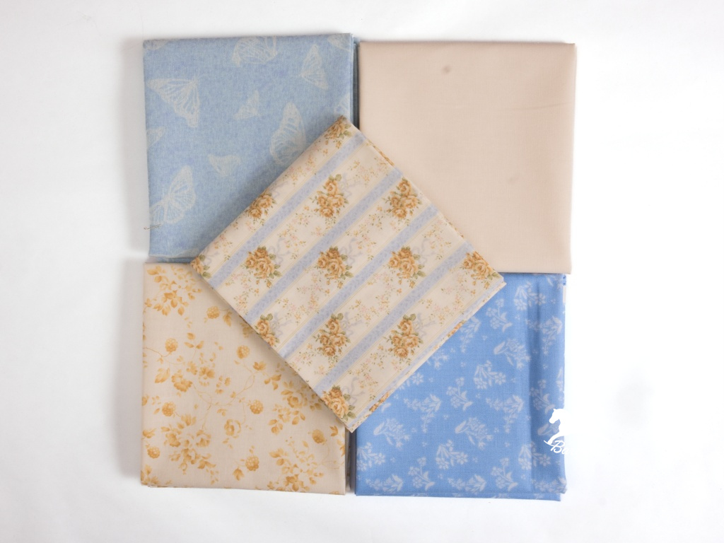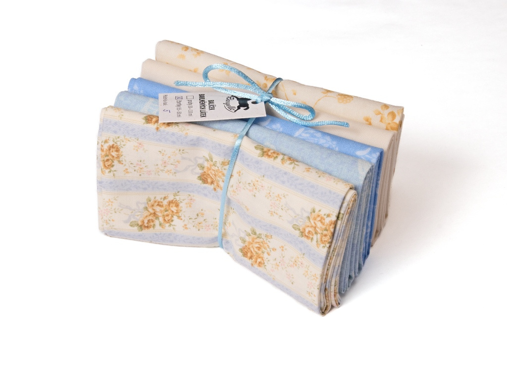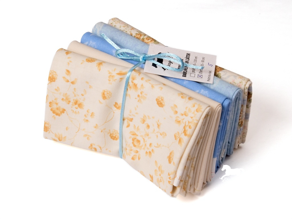 Barevná kombinace zahrnuje světle modrou Baby Blue, smetanově bílou a vanilkově žlutou. V balíčku najdete modrou látku s motýlky, modrou s jemnými kytičkami, jednobarevnou smetanovou, smetanovou s vanilkově žlutými květy a romantickou látku s pruhovaným vzorem, která celek krásně propojuje.
