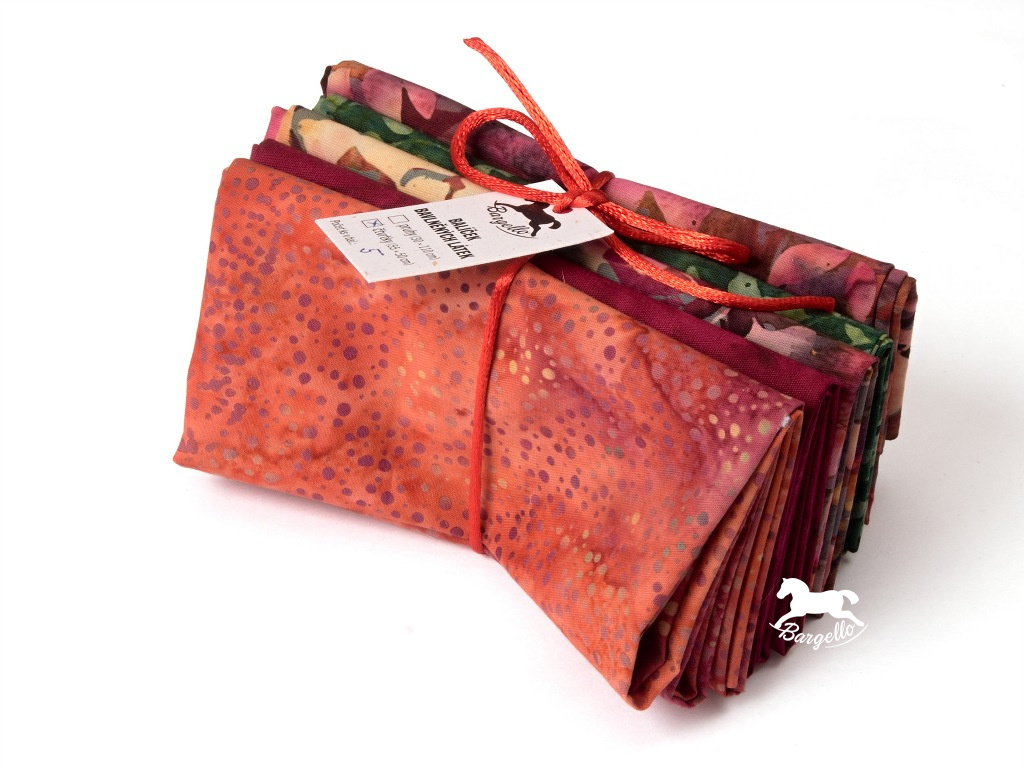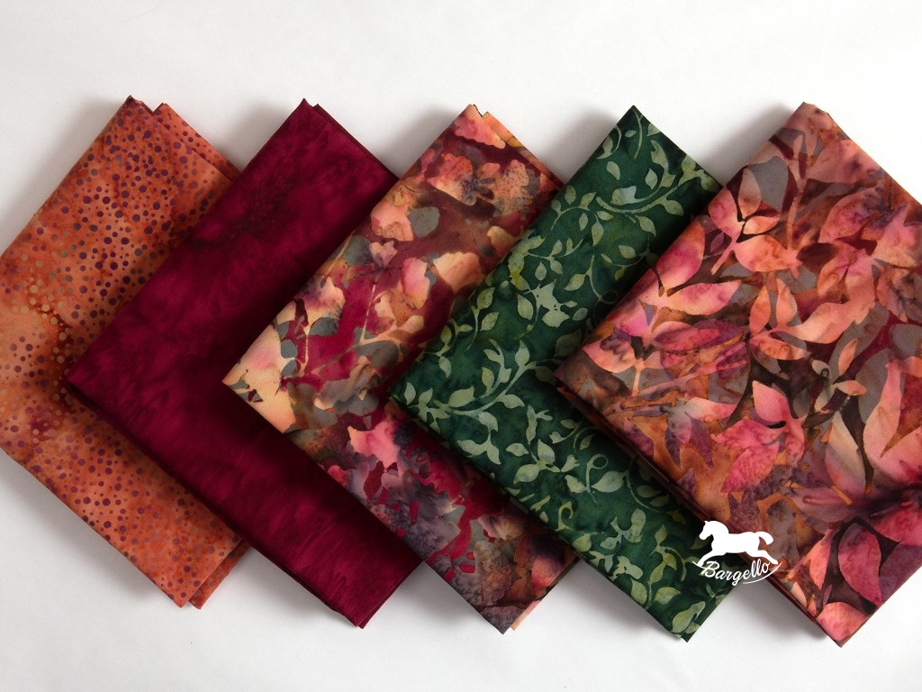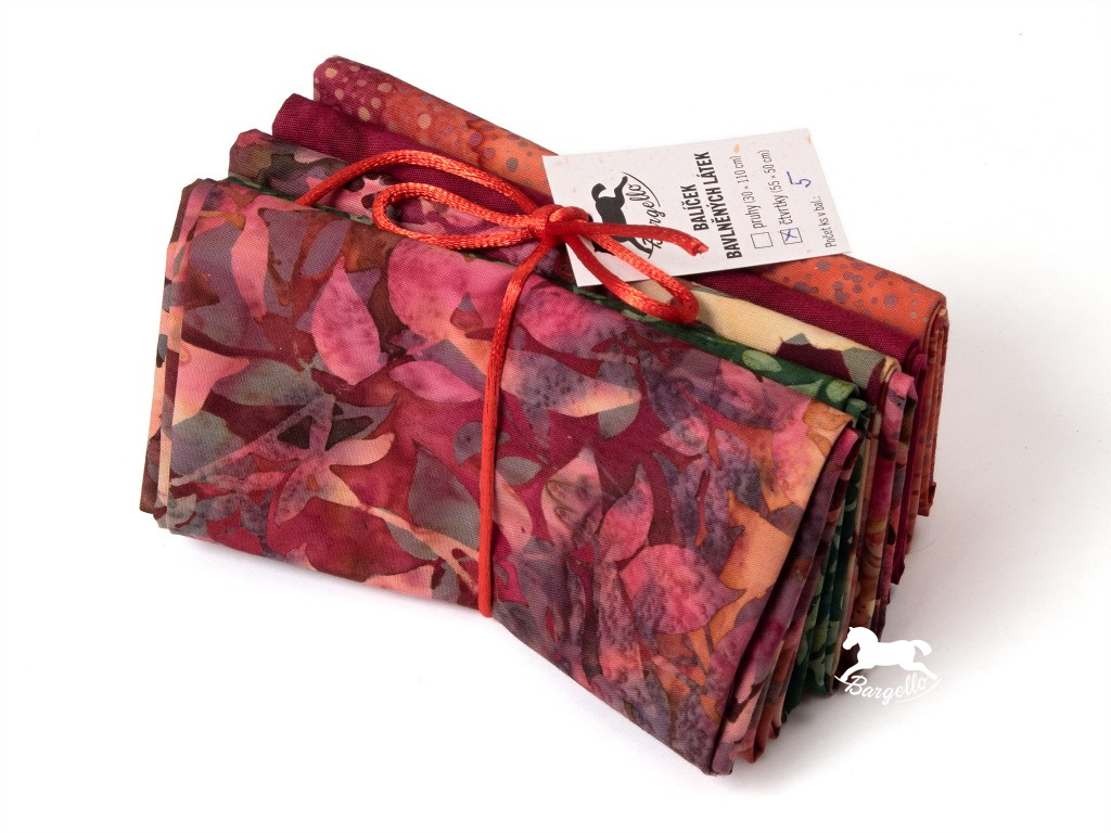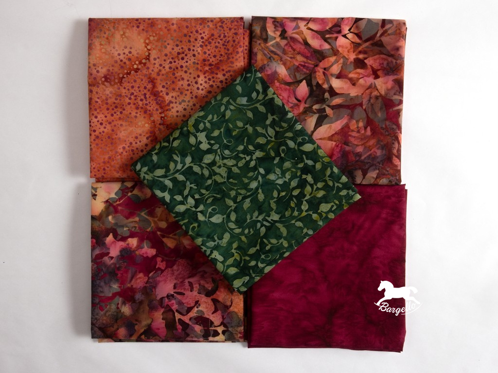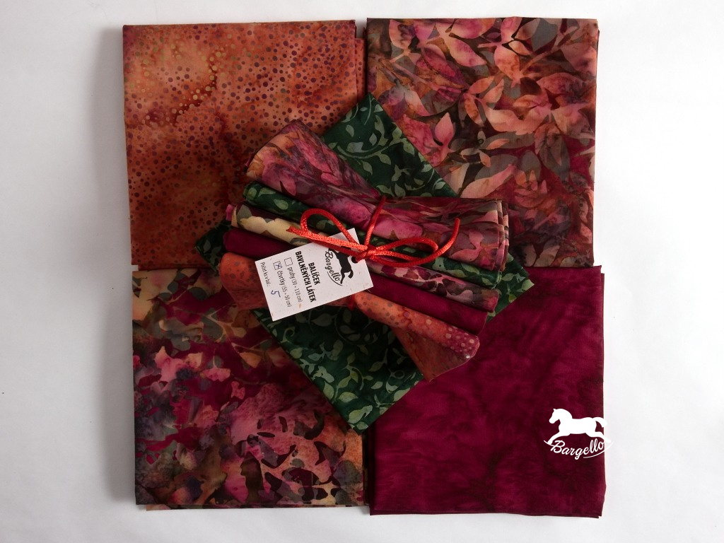 Barevná skladba je bohatá a kontrastní: jedlově zelená látka s jemnými lístečky, dvě květinové látky v kombinaci červené, růžové, šedozelené, hnědé a béžové, oranžová Bali Dots s vínově červenými skvrnami a puntíky a sytá světle vínově červená, která celek krásně uzemňuje.