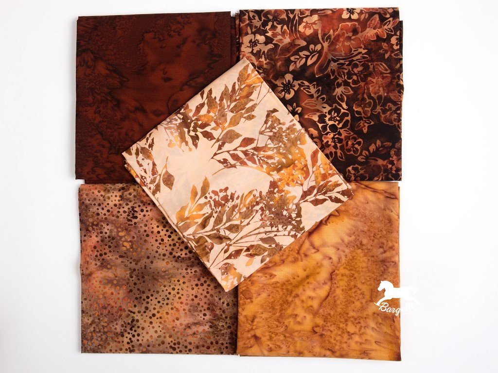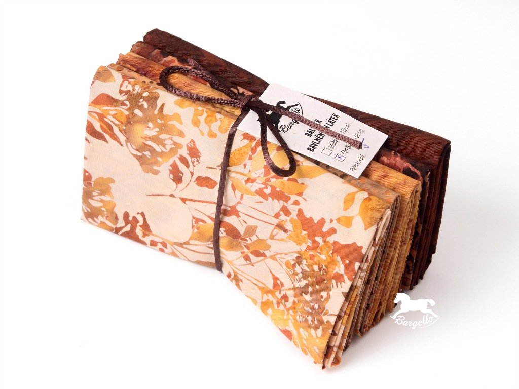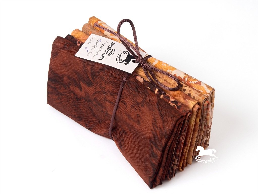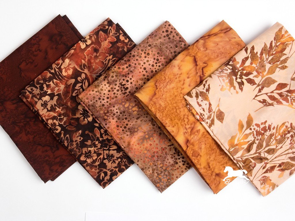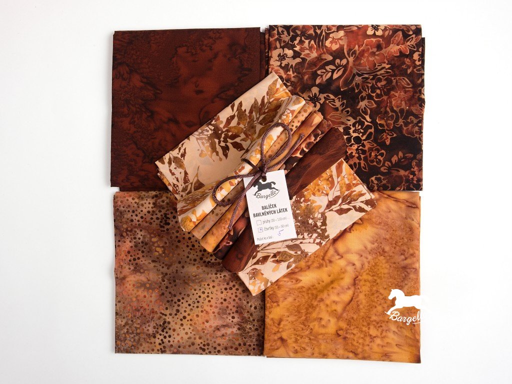 Balíček v podzimních barvách od tmavě hnědé po okrovou z batikovaných látek. 5 čtvrtek bavlněných látek, každá měří 50 x 55 cm.