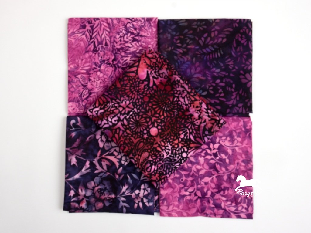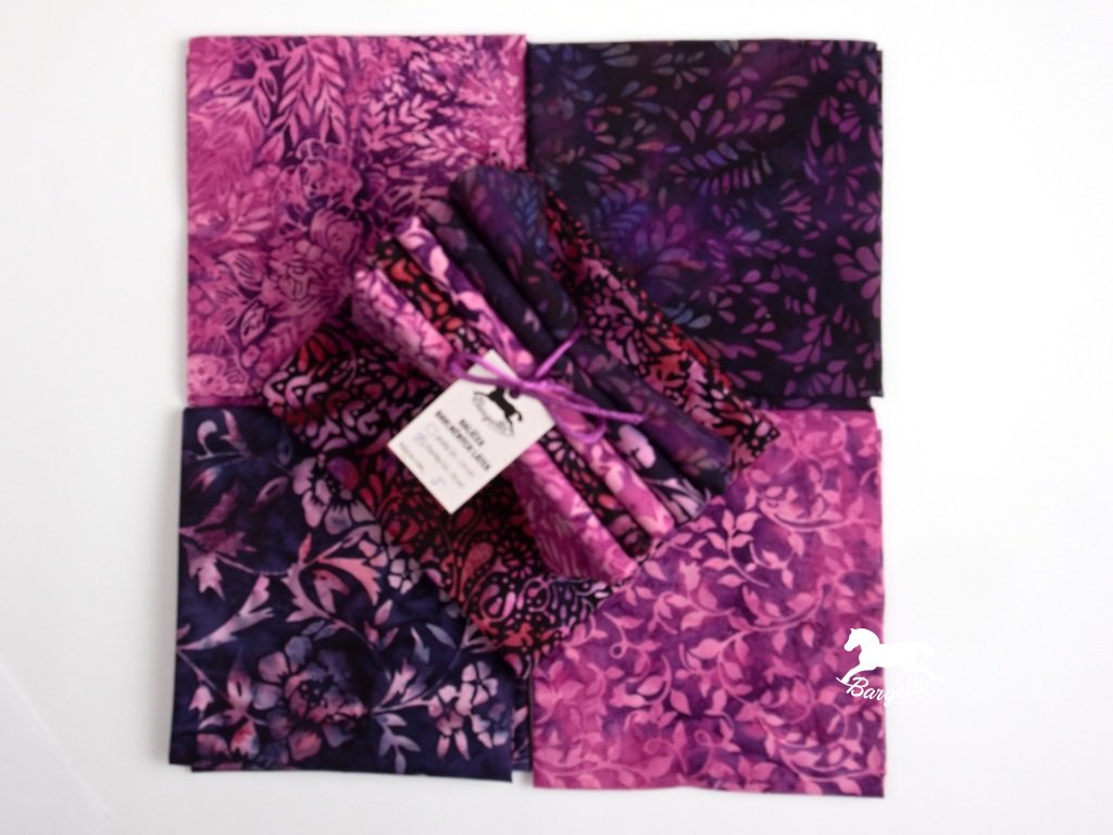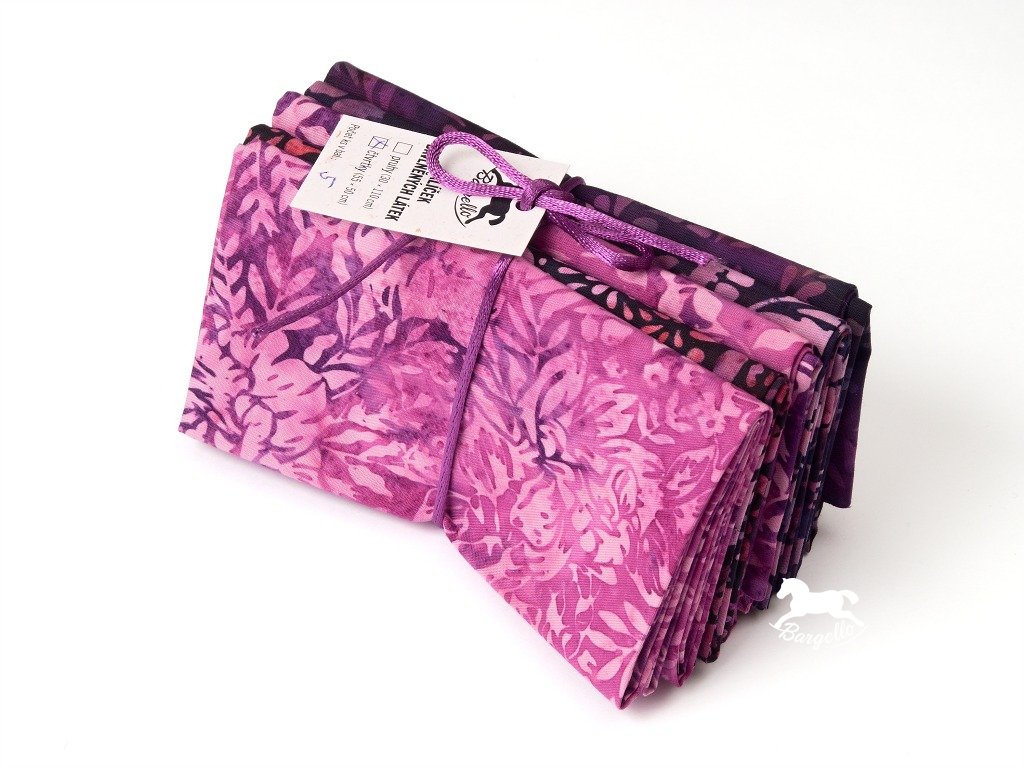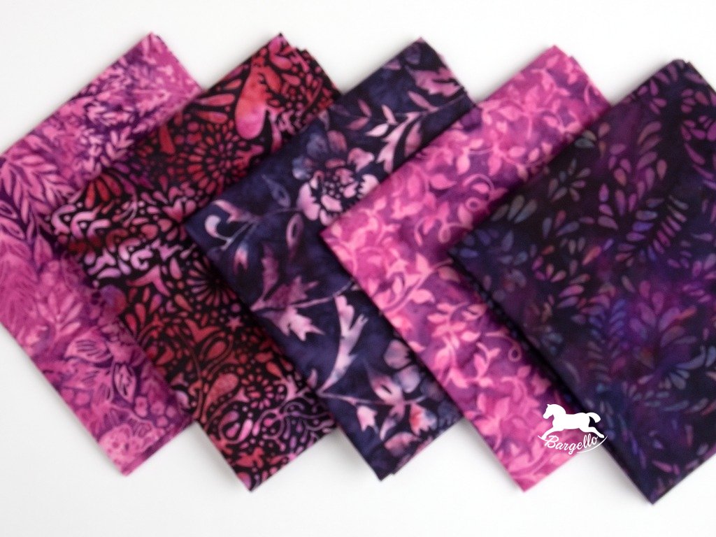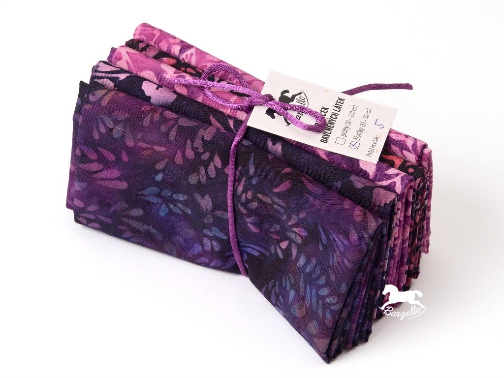Fialovo růžový balíček batikovaných látek pro odvážné. 5 čtvrtek bavlněných látek s kytičkovým vzorem, každá měří 50 x 55 cm.
