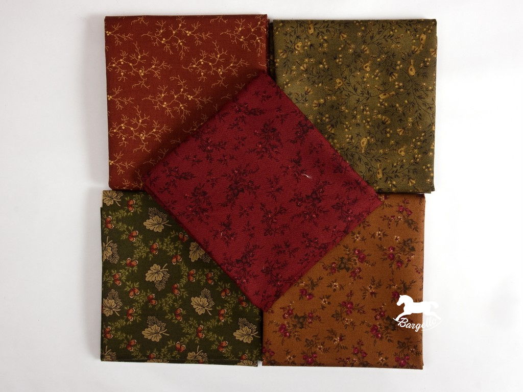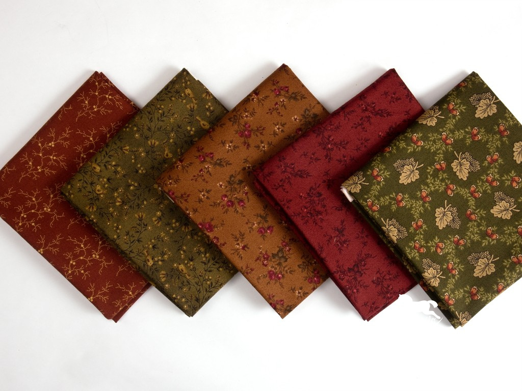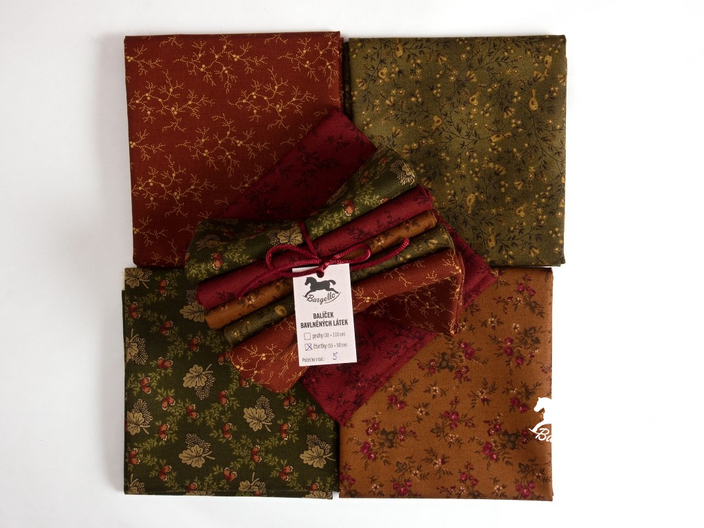 Barevná paleta je inspirovaná podzimem: hnědá, zrzavě hnědá, zelená a vínově červená. Drobné, klasické vzory se snadno kombinují mezi sebou i s jednobarevnými látkami a dodávají projektům harmonický vzhled.