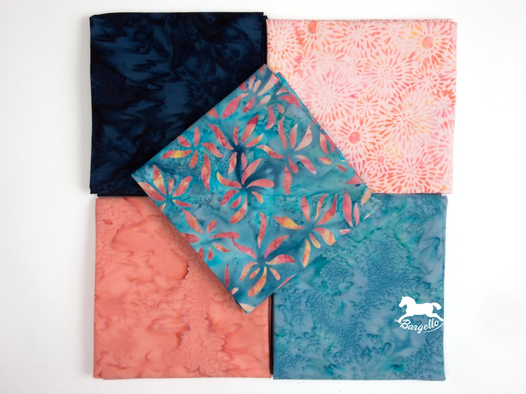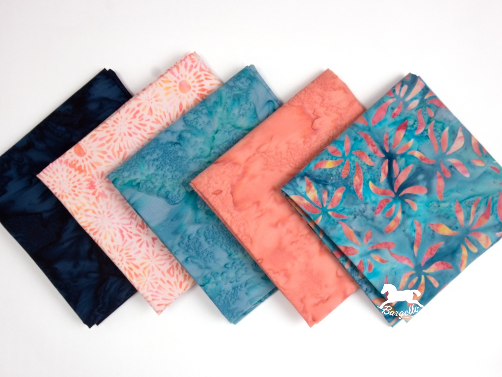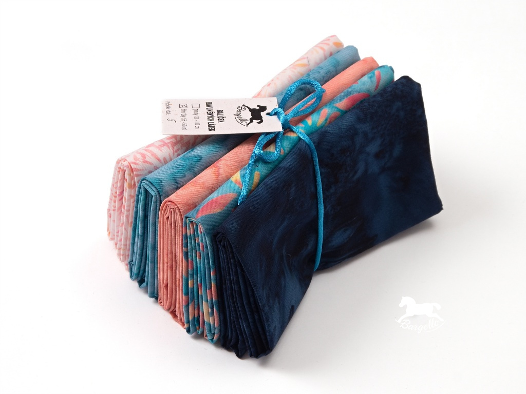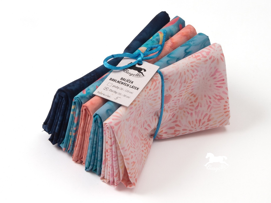 Balíček v růžovo-modré kombinaci z pěti batikovaných látek, každý kus měří 50 x 55 cm.Doplňkové parametry