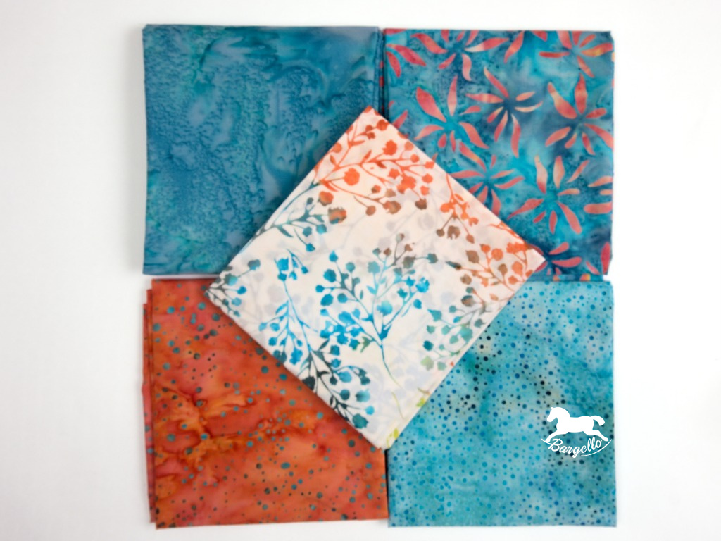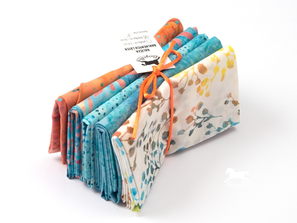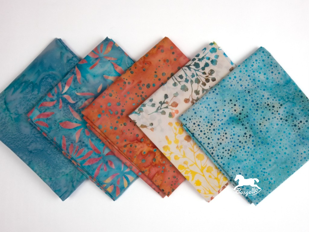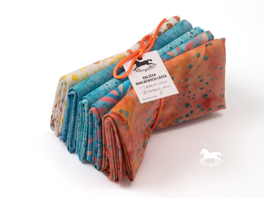 Balíček v modro - oranžové kombinaci z pěti batikovaných látek, každý kus měří 50 x 55 cm.Doplňkové parametry