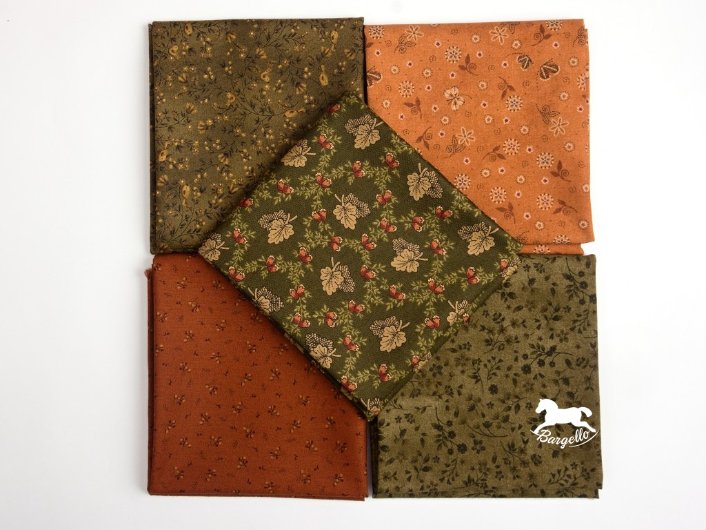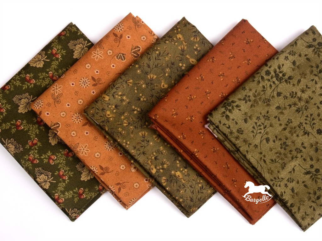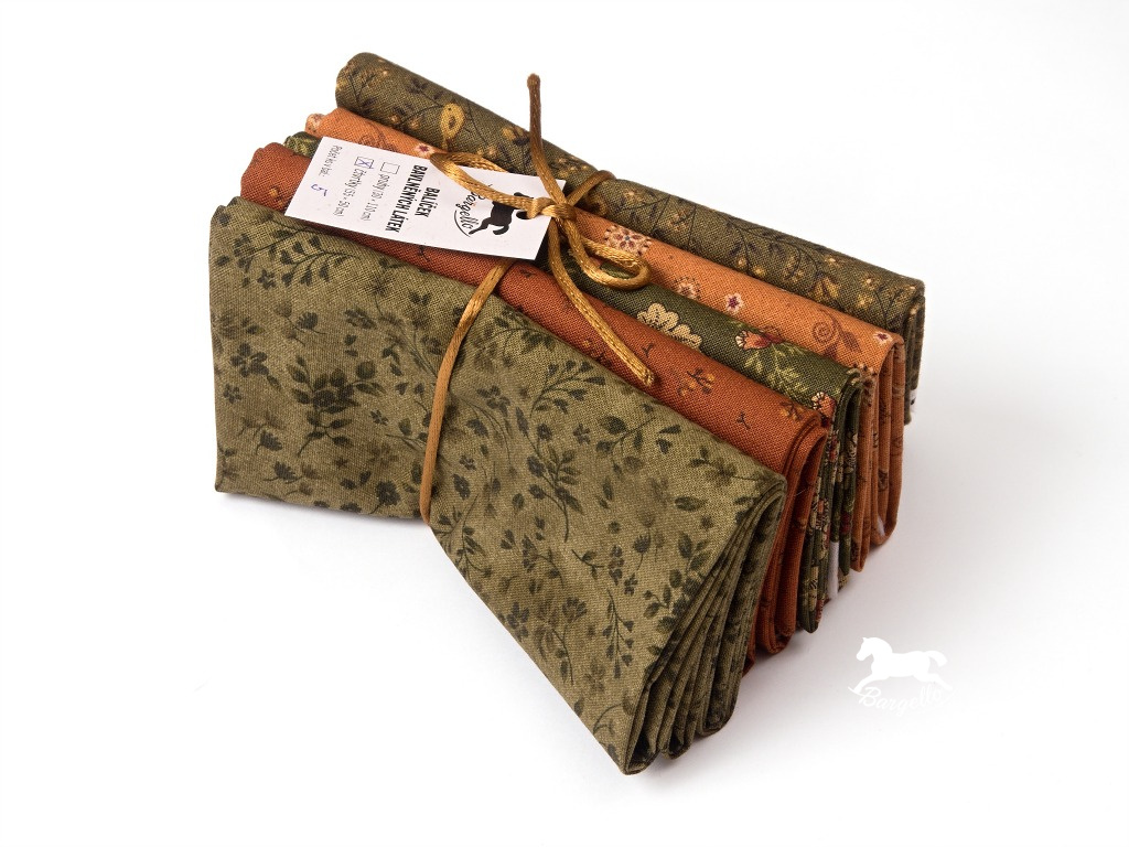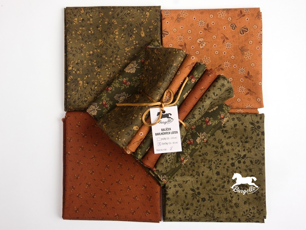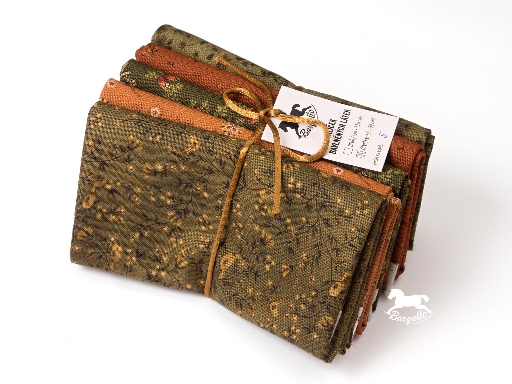 Podzimně laděný zeleno zrzavý balíček látek složený z různých kolekcí, které spolu barevně ladí. 5 čtvrtek bavlněných látek s kytičkovým vzorem, každá měří 50 x 55 cm.Doplňkové parametry