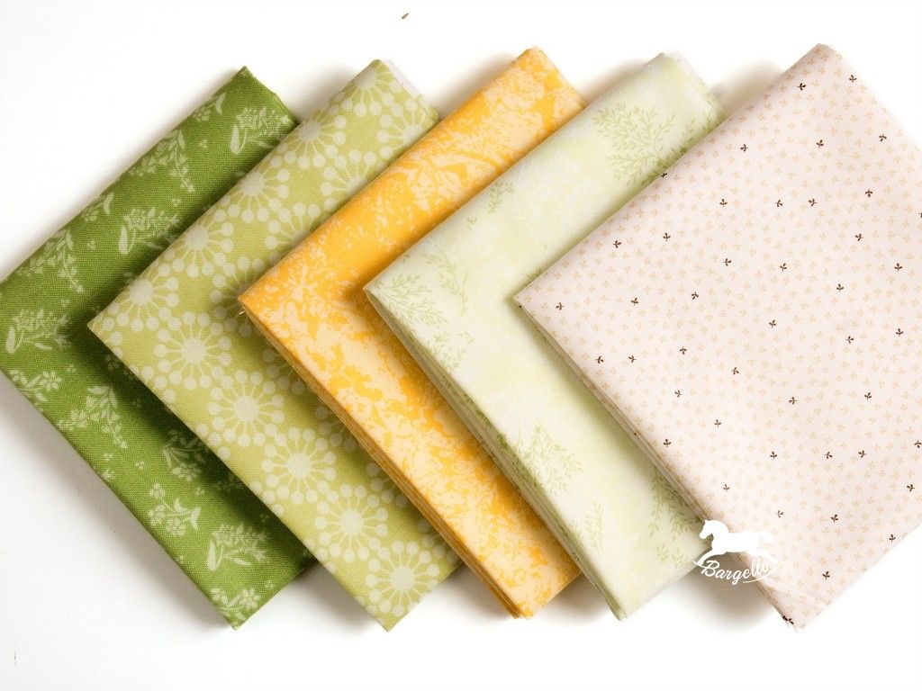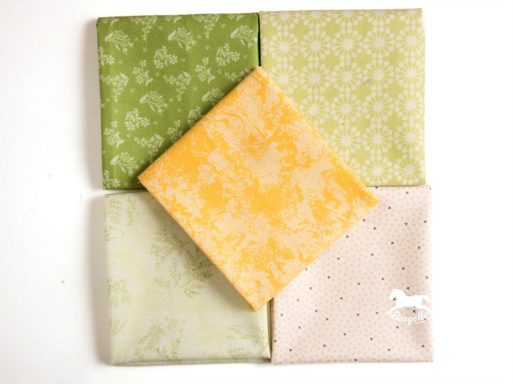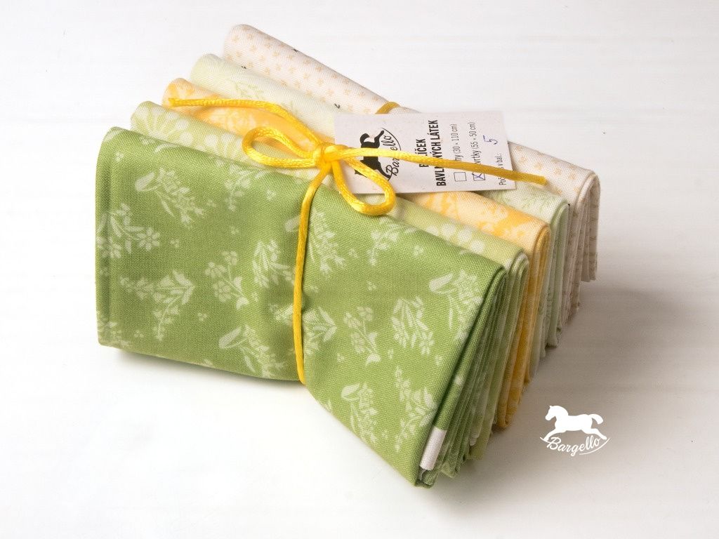 Balíček obsahuje 5 látek o velikosti 50 × 55 cm. Tři látky v různých odstínech zelené zdobí květinové vzory, které podtrhují jarní atmosféru. Žlutá látka s jemným batikovaným efektem dodává celku energii a kontrast. Celek doplňuje smetanově bílá látka s drobným, nenápadným vzorem.