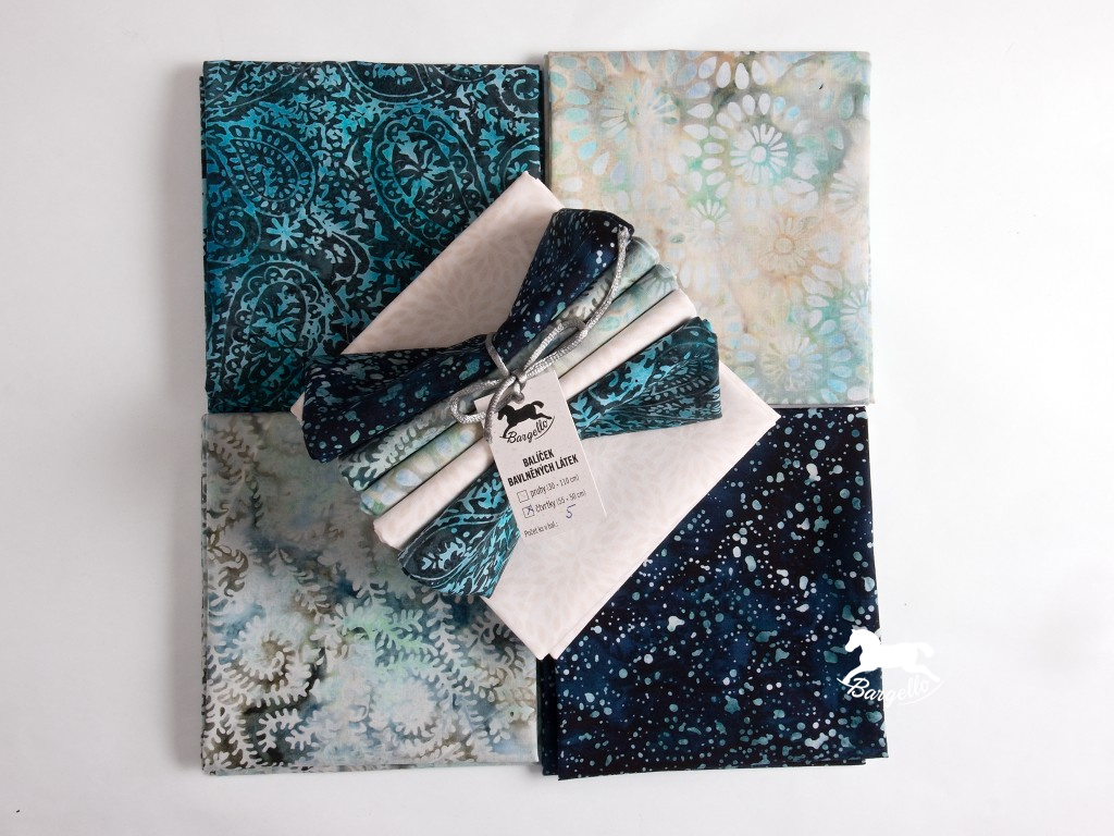 Balíček obsahuje 5 čtverců o velikosti 50 × 55 cm. Každá látka má svůj jedinečný batikovaný vzor, který přináší zajímavou strukturu a jemné barevné přechody typické pro ručně barvené textilie.