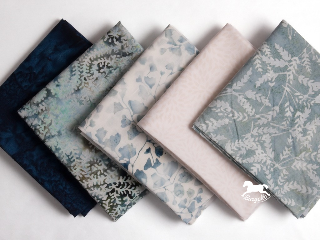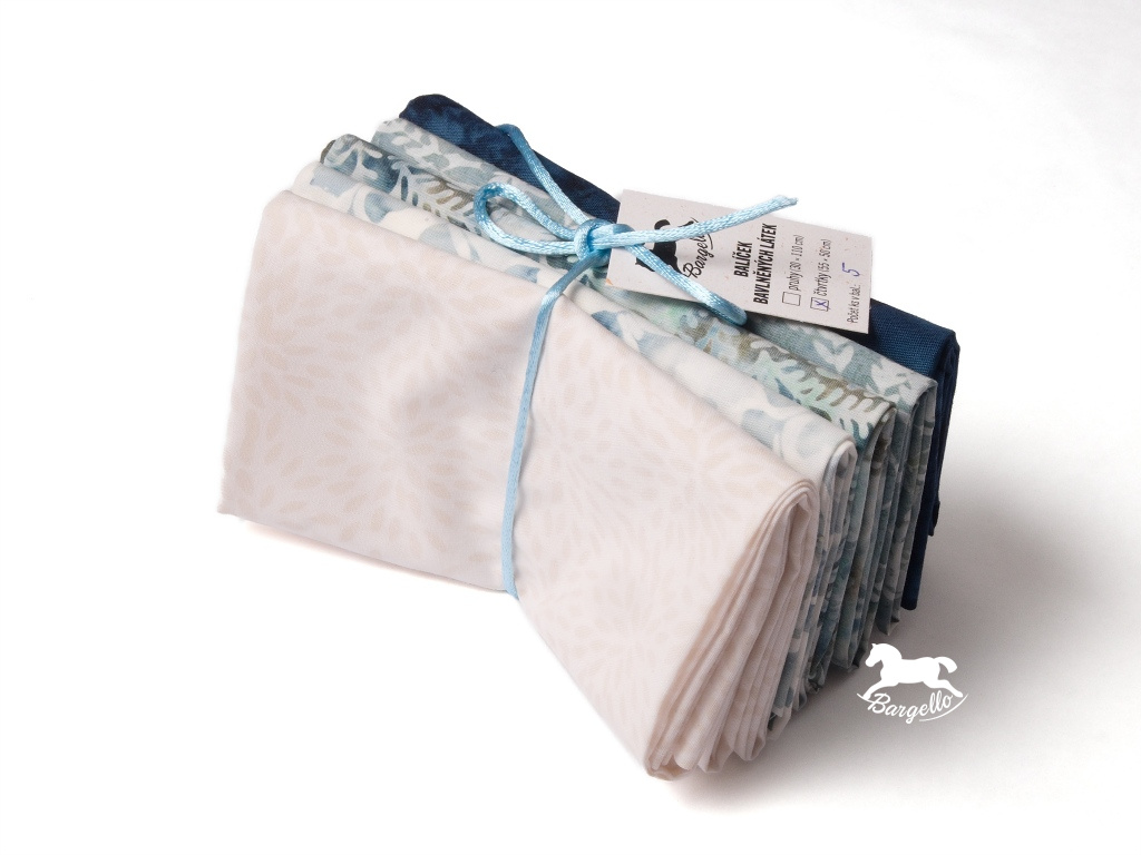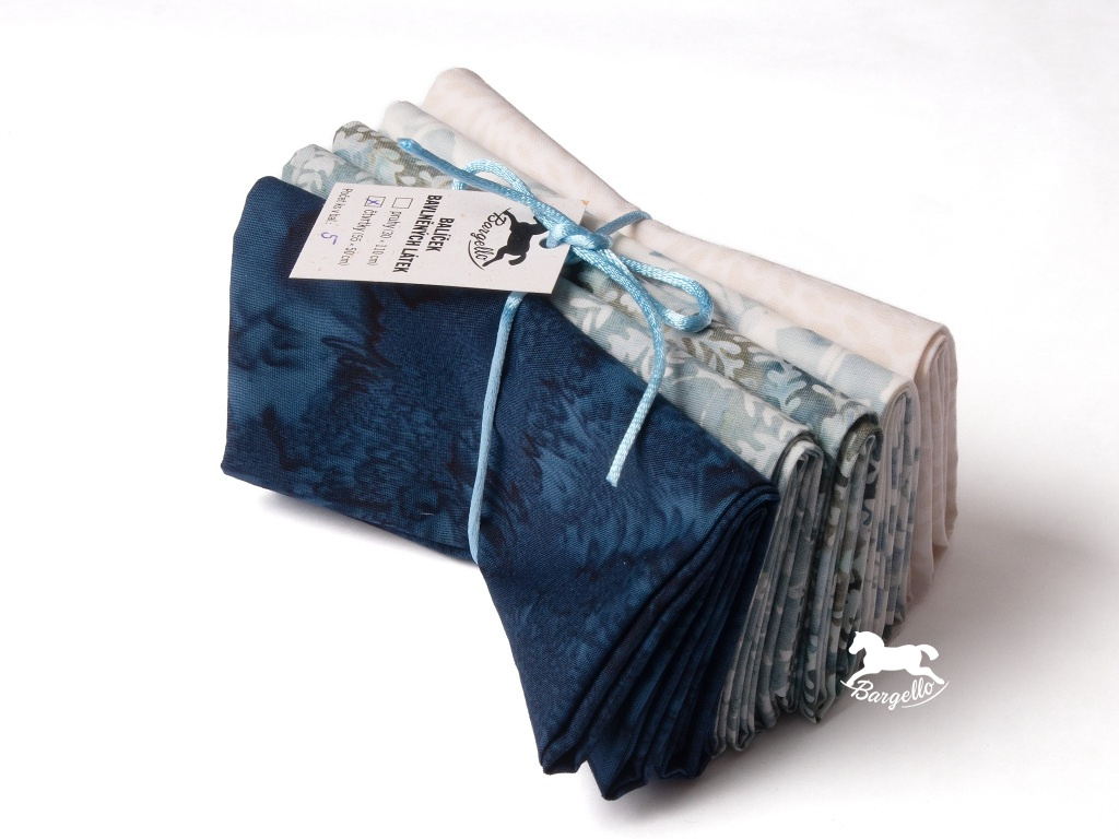 - Balíček 5 čtvrtek látek – 4 batikovaných Bali Handpaints + 1 temně modrá Bali Dyed