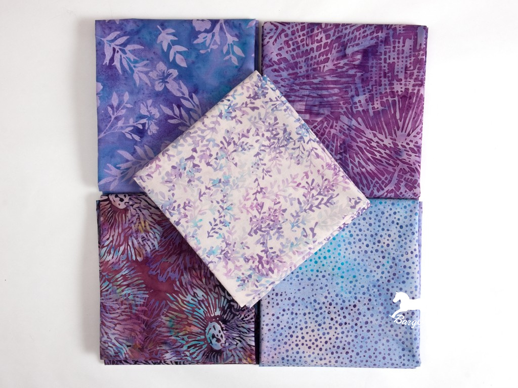 Barevná skladba připomíná jarní květy podléšek: světle modrá Bali Dots s tyrkysovými a fialovými puntíky, modrofialová látka s jemným fialovým vzorem kytiček, bílý látka s modro-fialovým vzorečkem, fialová s výraznými květy a fialová látka s abstraktním vzorem.