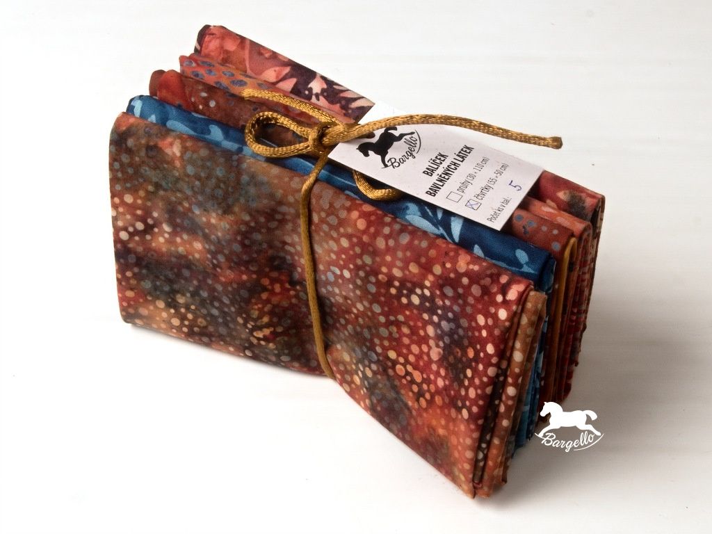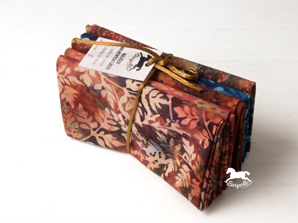 Balíček látek Podvečer je laděný do hřejivých hnědočervených odstínů, které evokují klidnou atmosféru zapadajícího dne. Celek je doplněn kontrastní šedomodrou látkou s jemným motivem lístečků, která dodává kombinaci svěžest a vyváženost. Balíček obsahuje 5 kusů látek o velikosti cca 50 × 55 cm, ideálních pro patchwork, quilting i další kreativní tvoření.