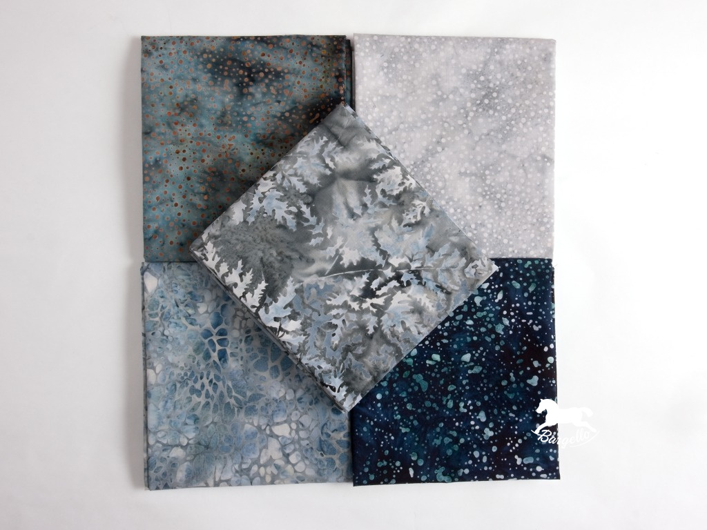 Balíček Před bouřkou spojuje batikované látky z oblíbených kolekcí Bali Handpaints a Bali Dots firmy Hoffman do harmonického celku inspirovaného proměnlivou oblohou těsně před příchodem bouře. Barevná škála přechází od světle šedé přes středně šedou a modrošedou až k tmavě modré s jemně kropenatým vzorem.