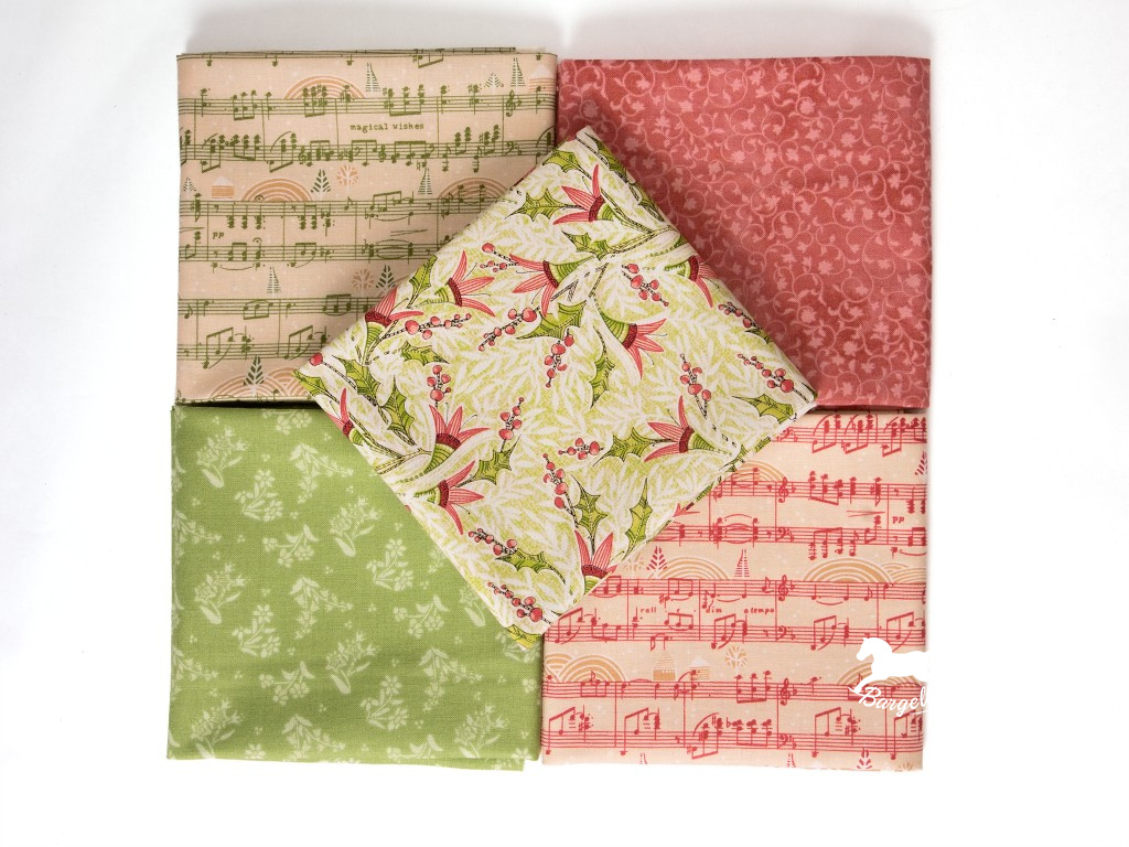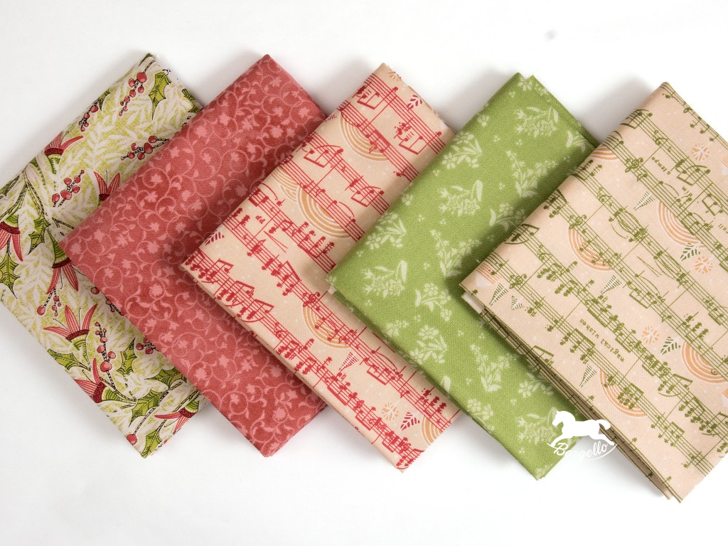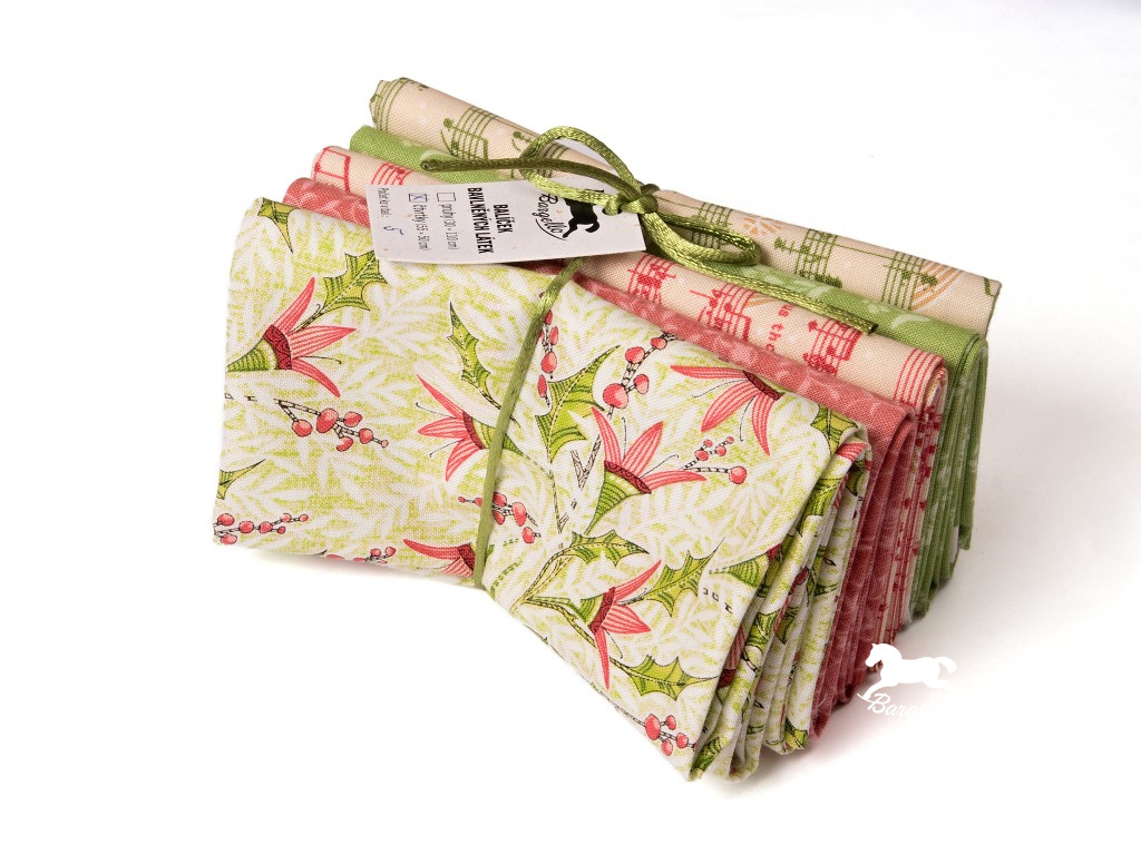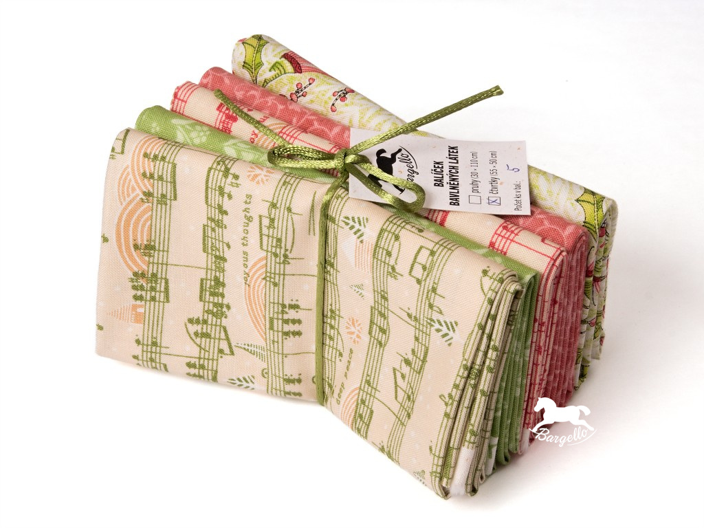Sing Song je hravý a netradiční balíček látek v jemné zeleno-růžové barevné kombinaci, která i přes původ ve vánoční kolekci působí svěže a harmonicky zapadá do jarní palety. Spojení květinových motivů a notových partitur dodává látkám originální a lehce poetický charakter.