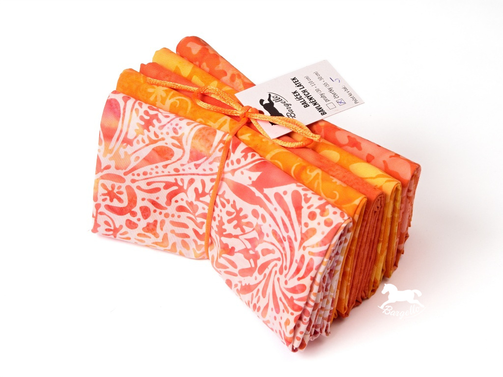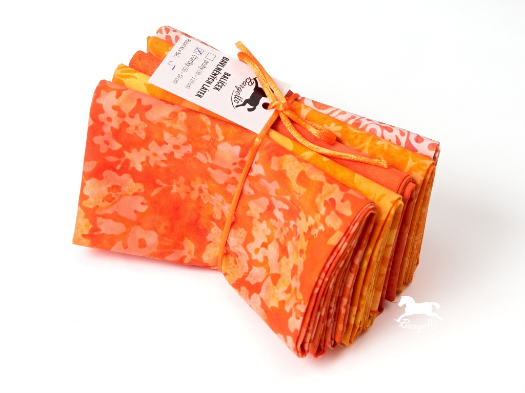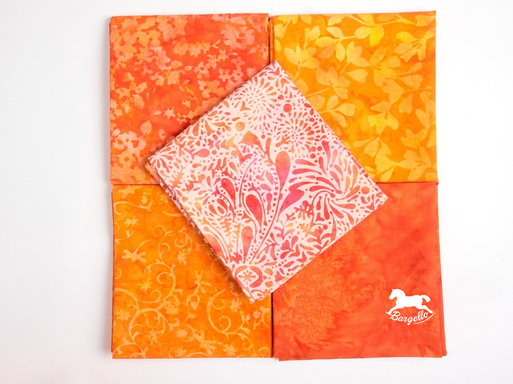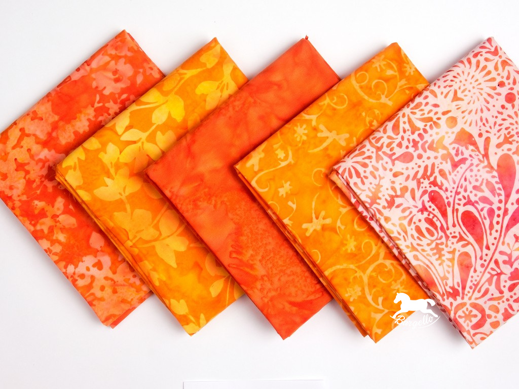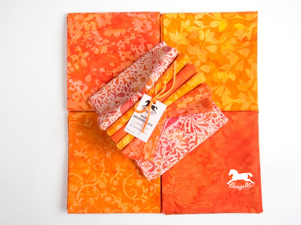 Zářivě žlutý balíček z batikovaných látek. 5 čtvrtek bavlněných batikovaných látek, každá měří 50 x 55 cm.Doplňkové parametry