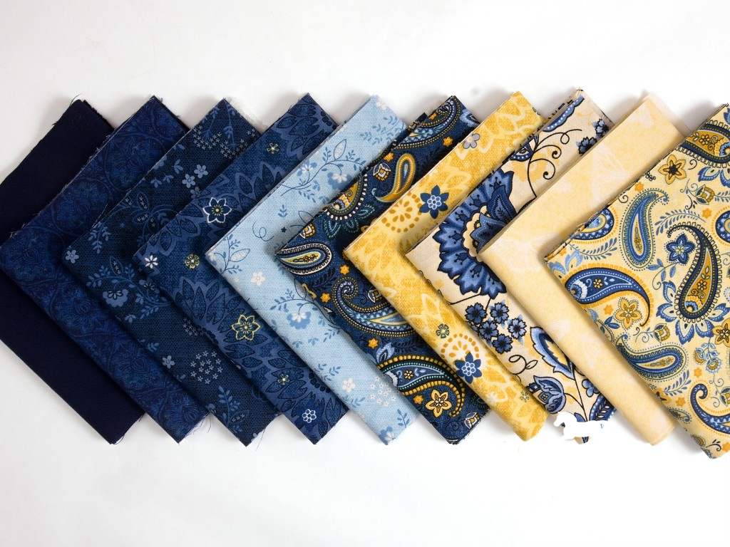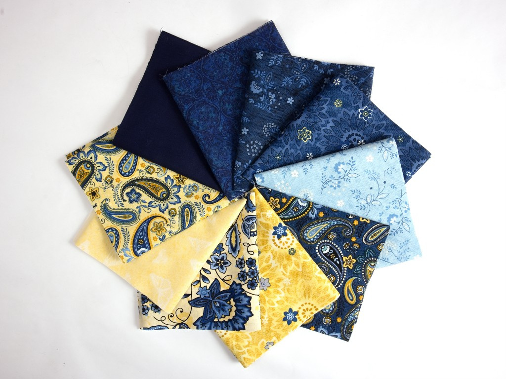 Balíček látek Modrožlutý je složen z kvalitních bavlněných látek z kolekce Black Bird, které jsou doplněny jednobarevnou indigo modrou, jemnou vanilkově žlutou s motivem motýlků a tmavě modrou látkou z kolekce Banyan.