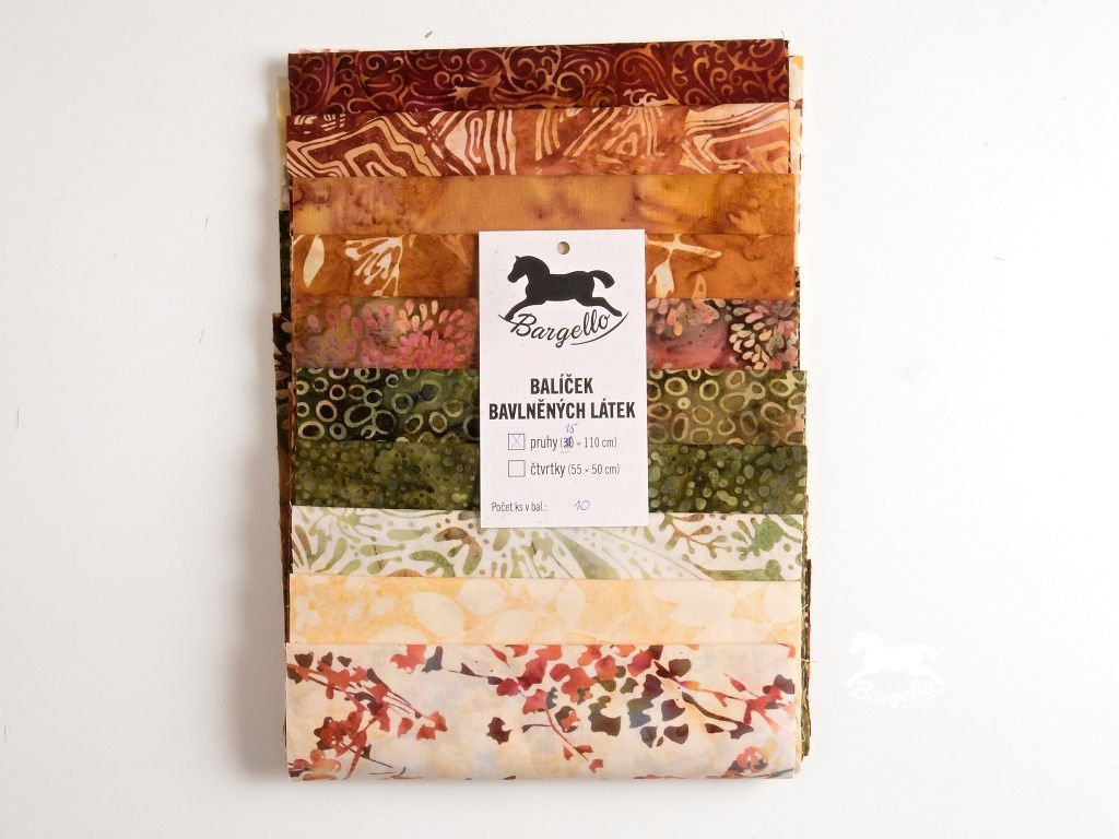 Balení obsahuje 10 batikovaných pruhů o rozměru 15 × 110 cm a gramáži 102 g/m² ze 100% bavlny. Užší pruhy jsou ideální pro detailní patchwork, lemování, proužkové techniky nebo menší šicí projekty.