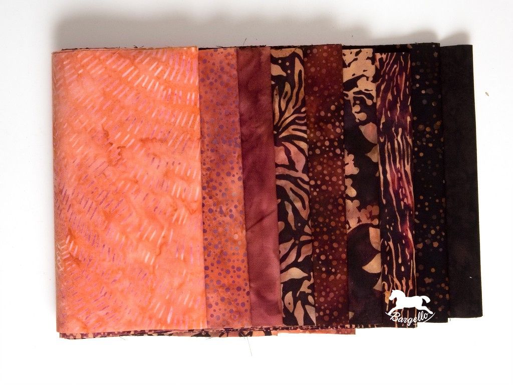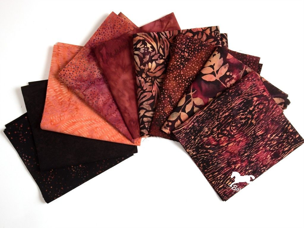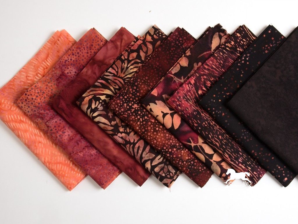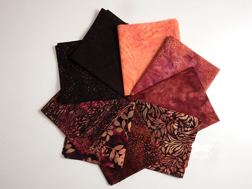 Látky pocházejí z kolekcí Bali Dots a Bali Handpaints od renomované značky Hoffman, která je známá precizní ruční batikou a bohatými, sytými barvami.