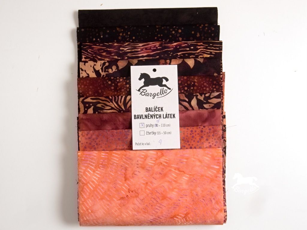 Sada obsahuje 9 batikovaných pruhů o rozměru 15 × 110 cm, vyrobených ze 100% bavlny s gramáží 102 g/m². Užší formát je ideální pro drobný patchwork, proužkové techniky, lemování i menší kreativní projekty.