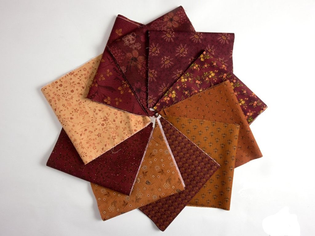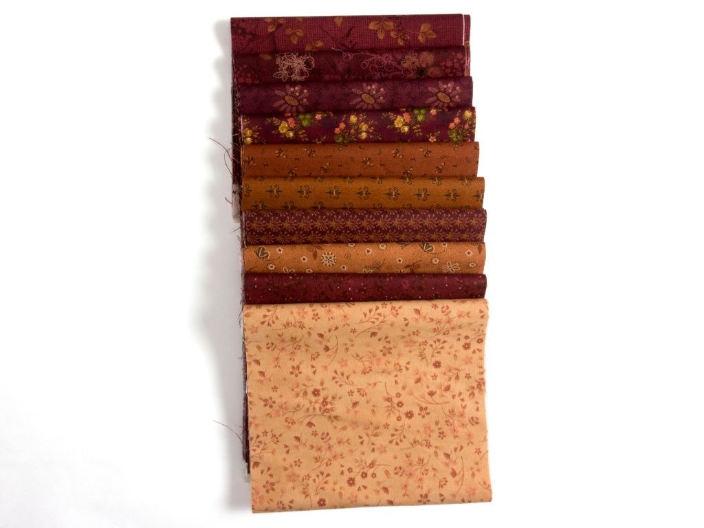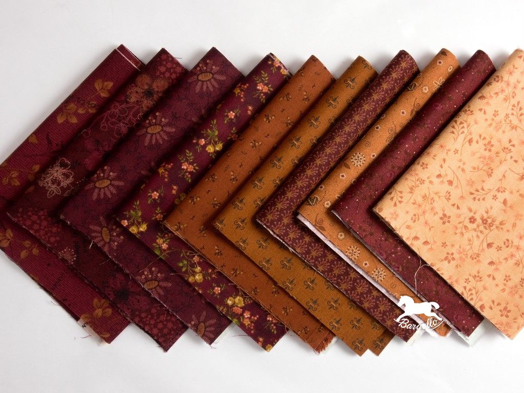 Balíček patchworkových látek Teplo domova je laděný do hřejivých odstínů vínově červené a zrzavé, které evokují příjemnou atmosféru plápolajícího ohně v krbu. Kombinace barev působí elegantně a nadčasově.
