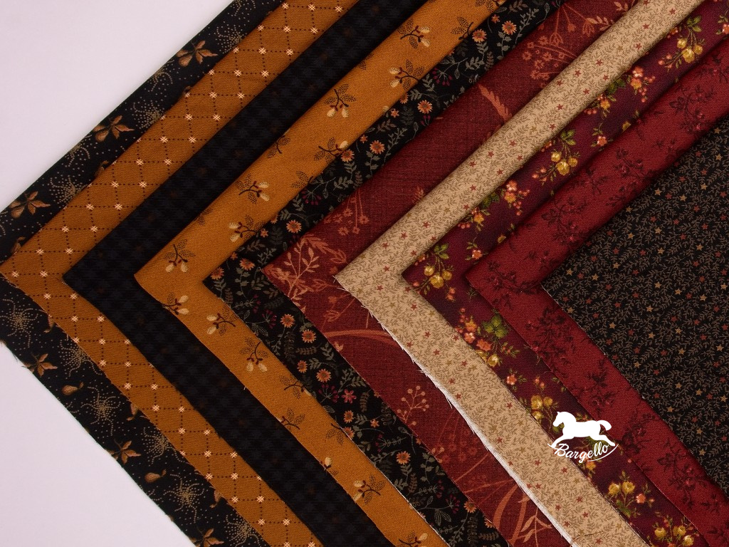Balíček bavlněných látek obsahuje deset pruhů červených, černých a zlatožlutých látek. Každý pruh má délku 30 cm a šířku 110 cm.