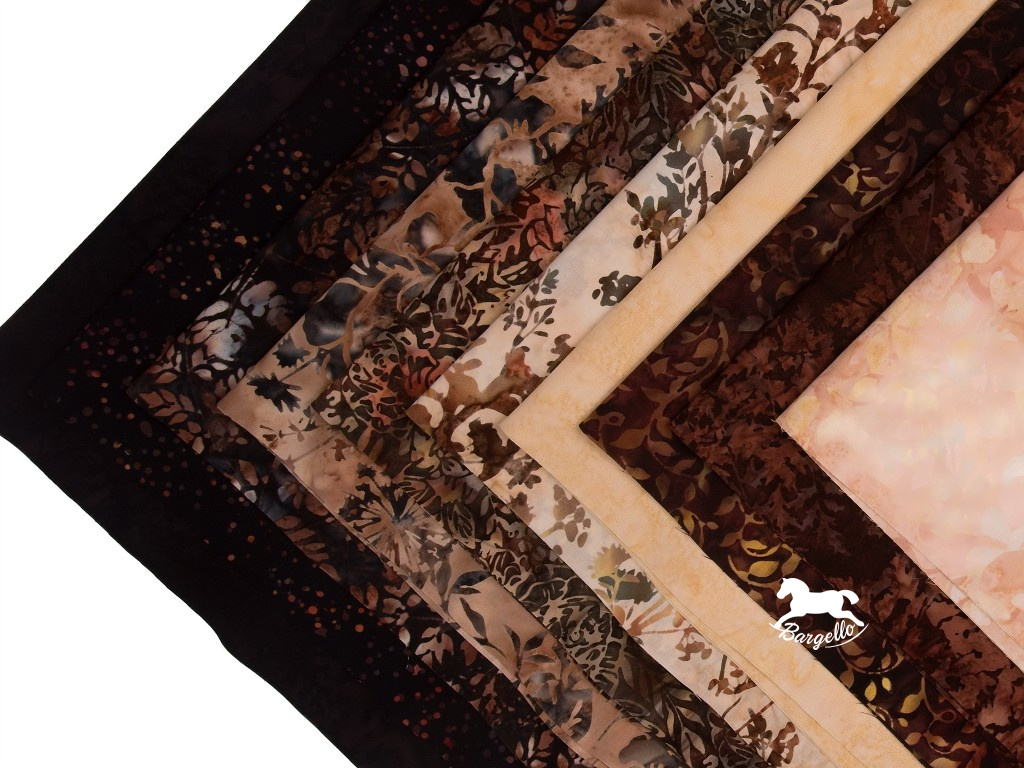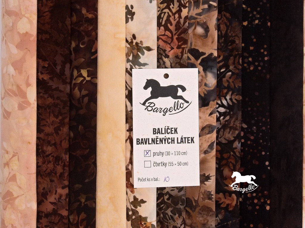 Balíček batikovaných látek naladěný do barvy kávy, černé, latté i capuccina obsahuje deset pruhů látek. Každý pruh má délku 30 cm a šířku 110 cm.