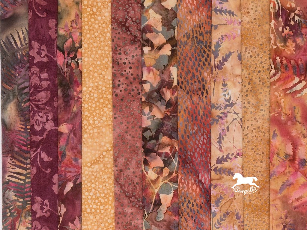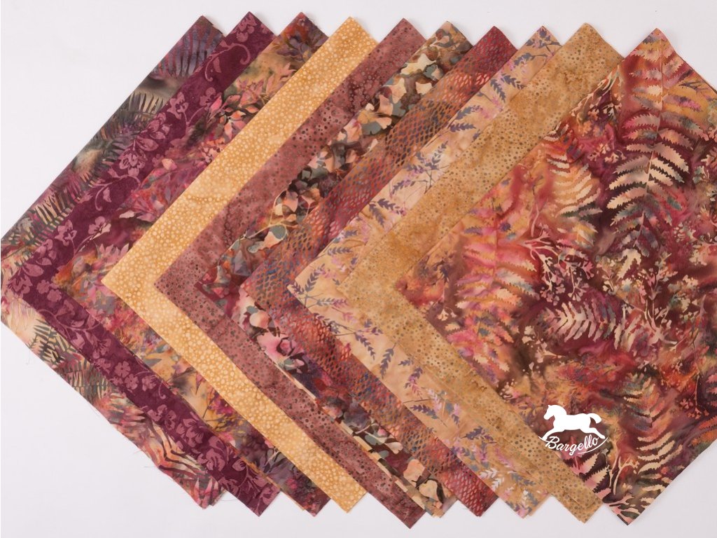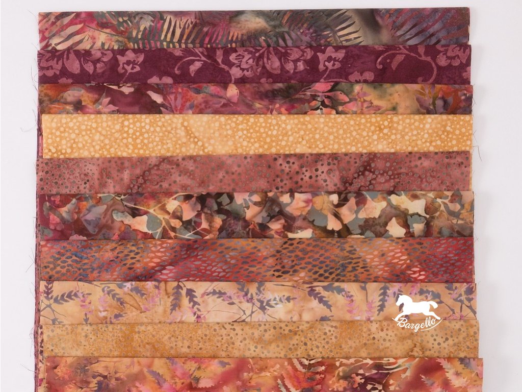 Balíček vínových a okrových batikovaných látek v podzímním ladění obsahuje deset pruhů látek. Každý pruh má délku 30 cm a šířku 110 cm.