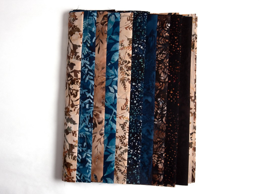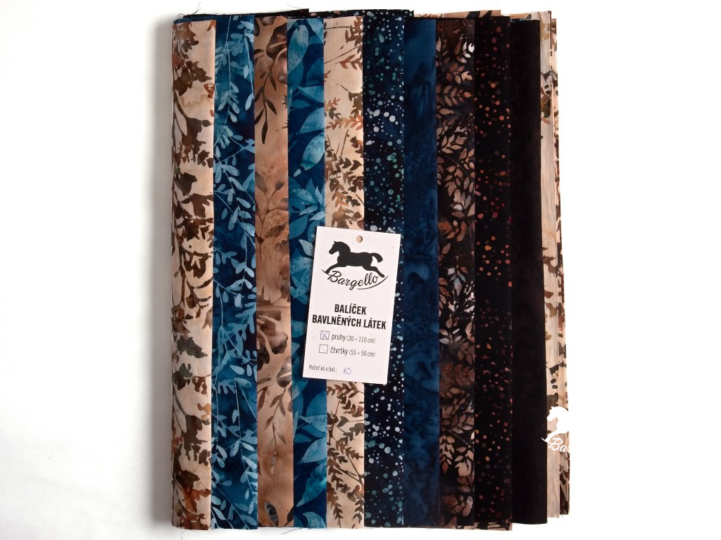 Balíček batikovaných bavlněných látek Hlubina z kolekce firmy Hoffman je pečlivě sestaven z 10 pruhů o rozměru 30 × 110 cm, které dohromady tvoří elegantní a vyvážený celek. Barevné ladění pracuje se dvěma hlavními liniemi – sytými tóny tmavě hnědé a tmavě modré, které plynule přecházejí do jemnějších odstínů modrošedé a béžové. Výsledkem je nadčasová kombinace vhodná pro klasické i moderní patchworkové projekty.