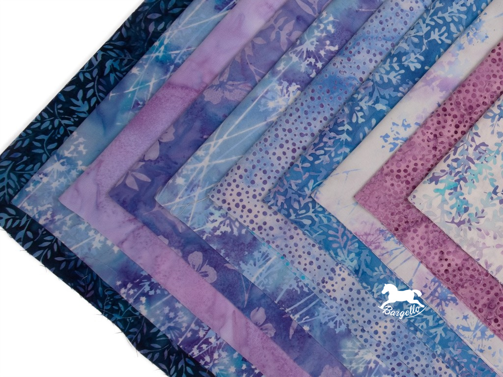 Modro fialový balíček batikovaných látek obsahuje deset pruhů látek. Každý pruh má délku 30 cm a šířku 110 cm.