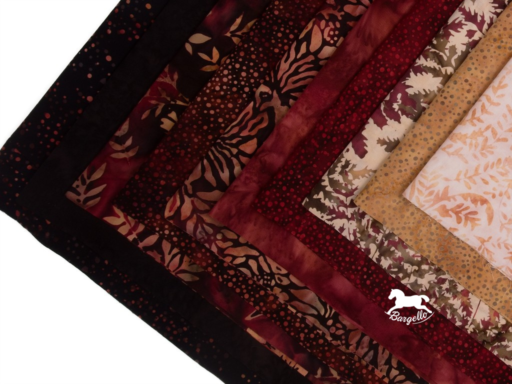 Elegantní balíček batikovaných látek v barvách oblíbeného dortíku obsahuje deset pruhů látek. Každý pruh má délku 30 cm a šířku 110 cm.