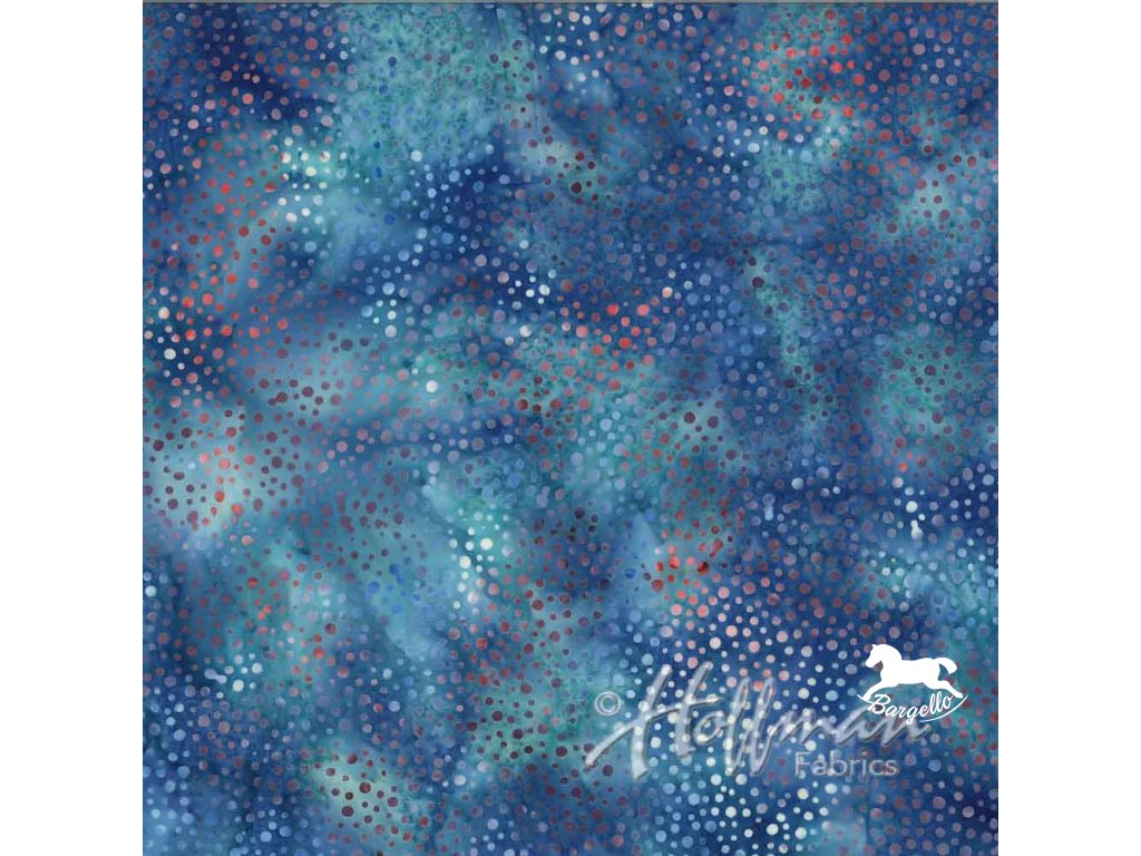 Modrá batikovaná látka s bílými a růžovými puntíky z kolekce Bali Dots, 100% bavlna, šířka 110 cm.