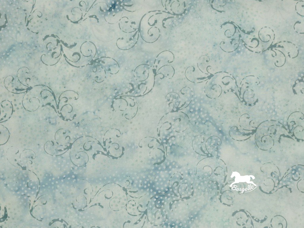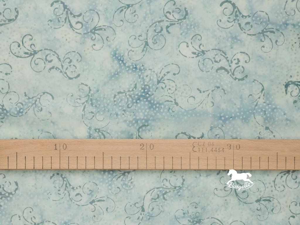 Světlá šedomodrá batikovaná látka s bílými tečkami a ornamentálním vzorem.