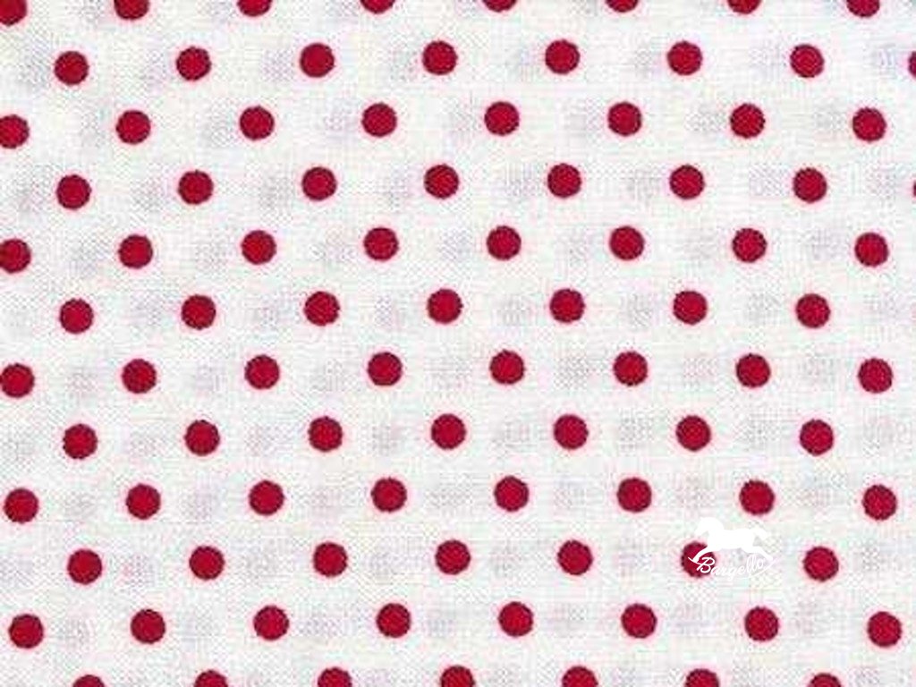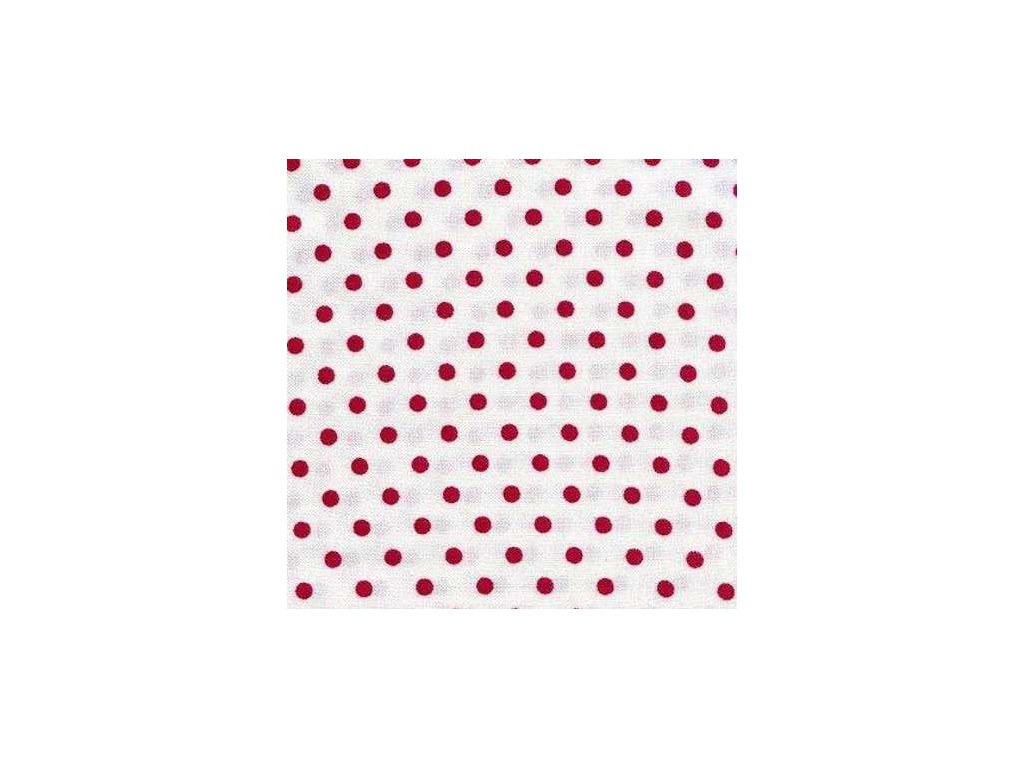 Bílá látka s červenými puntíky . Šířka látky je cca 110 cm. Posledních 60 cm vcelku s 30% slevou.