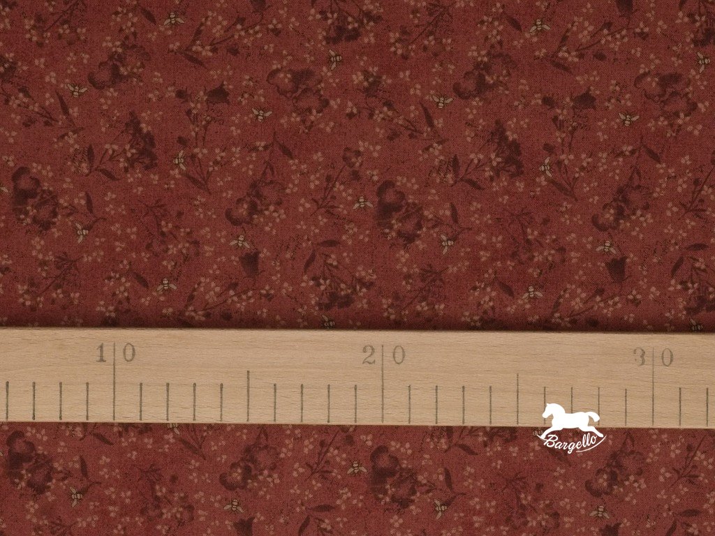 Červená bavlněná látka s květinovým vzorem a občasnou včelou z kolekce Time Well Spent návrhářky Janet Rae Nesbitt z One Sister. Posledních 23 cm vcelku s 30% slevou.