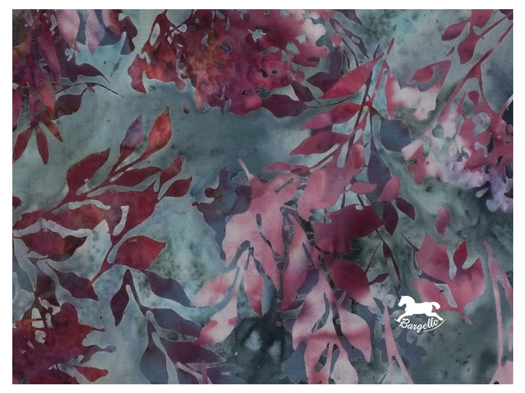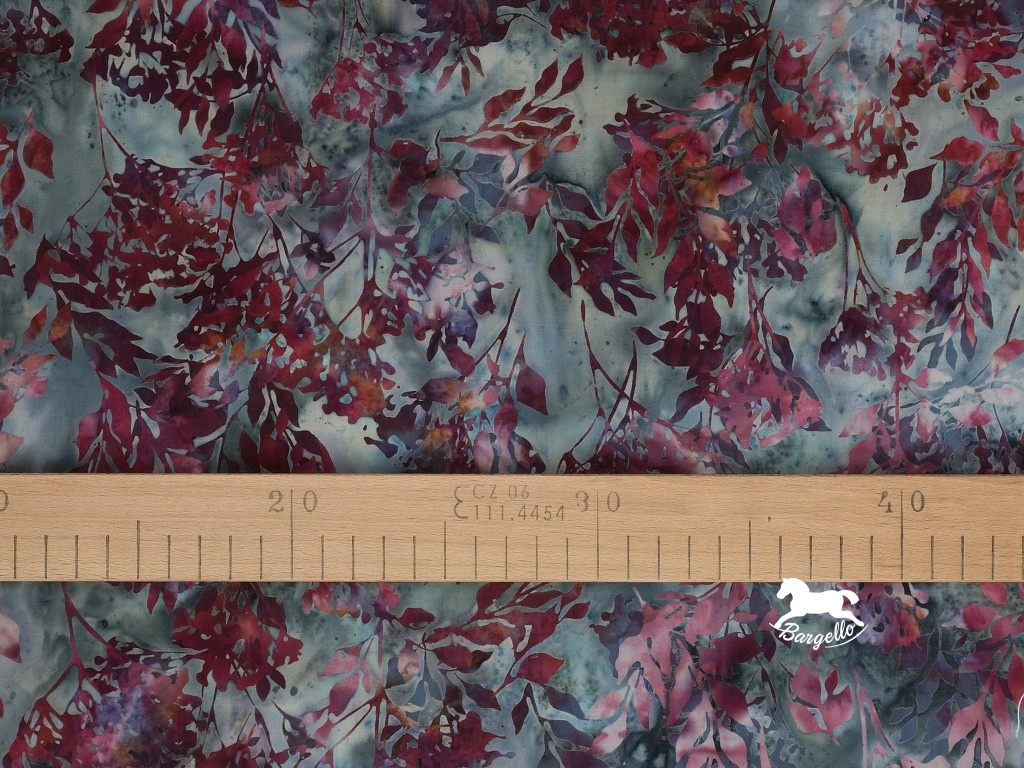 Šedomodrá čtvrtka s vínově červeným vzorem listů a větviček je nařezána z batikované látky Bali Hanpaints Breakers a měří 50x55 cm. Fat Quarter, 100% bavlna. Tato látka se dobře kombinuje s šedými i vínově červenými batikami.