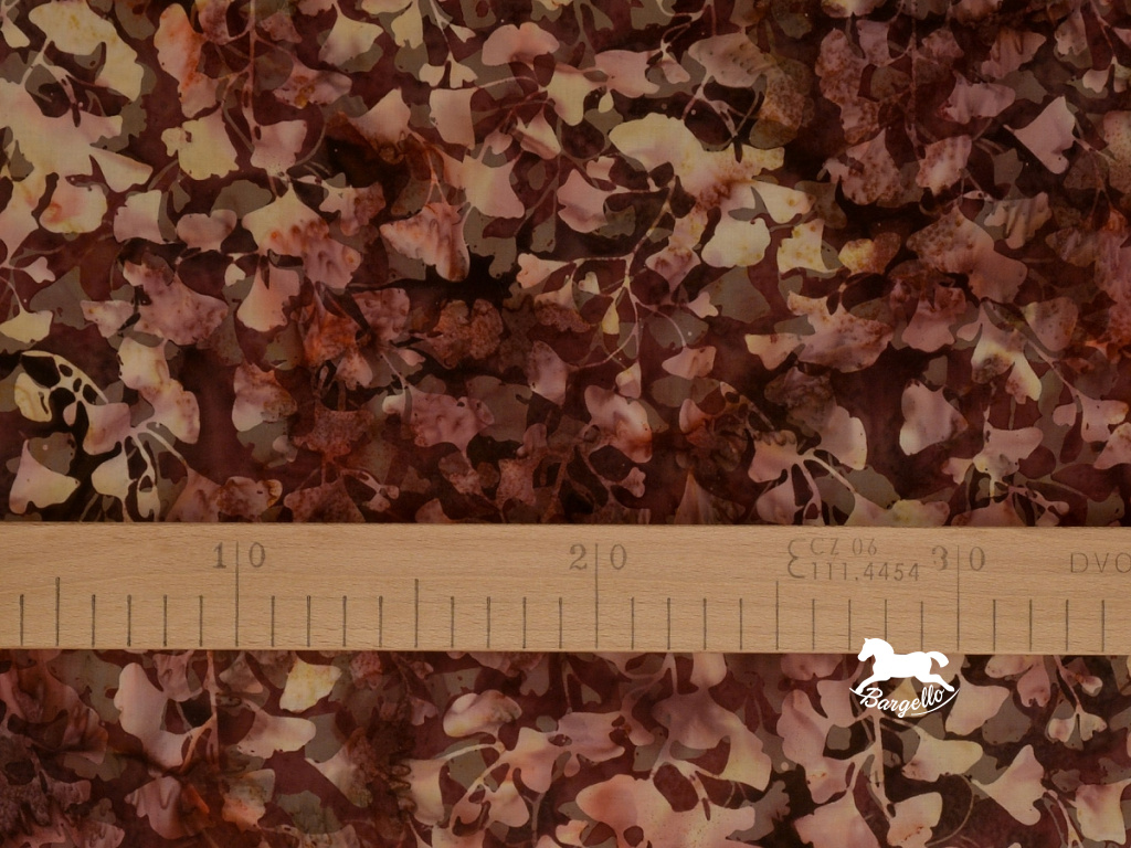 Čtvrtka z mnohobarevné batikované látky Night Shade z kolekce Bali Handpaints měří 50x55 cm. Fat Quarter s listy ginkga v zajímavé barevné kombinaci vínově červené, růžové, hnědé, olivově zelené a béžové se bude krásně kombinovat s ostatními batikami ze stejné kolekce. 100% bavlna. Tento vzor si můžete koupit i v metráži.