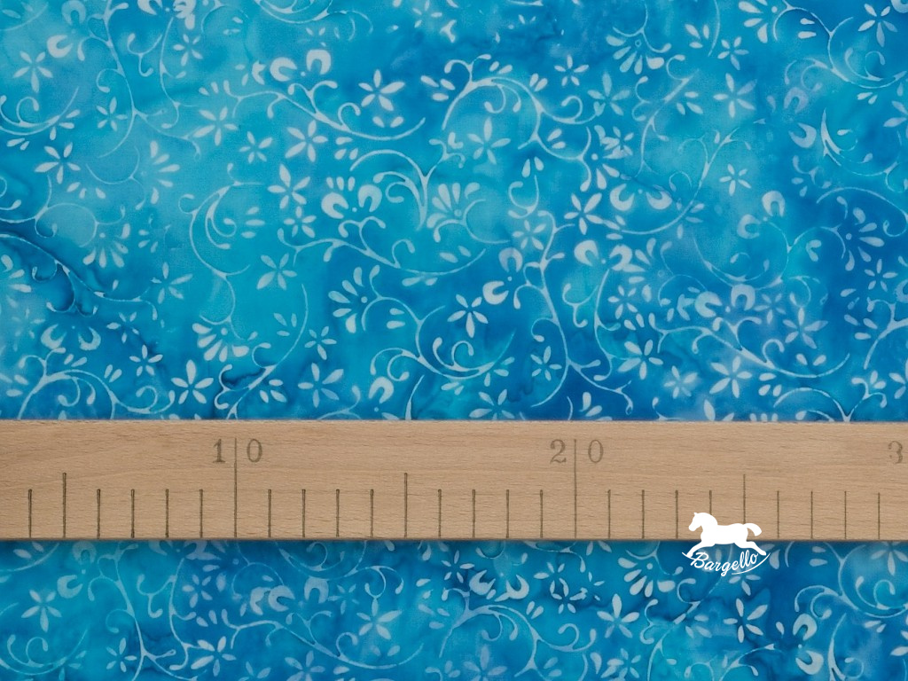 Čtvrtka z tyrkysově modré batikované látky s modrobílým ornamentálním květinovým vzorem měří 50x55 cm. Čtvrtka je nařezána z metráže z kolekce batikovaných látek Bali Hanpaints od firmy Hofmann. Látka je vyrobena ze 100% bavlny, s gramáží 102g/m2. Čtvrtky látek můžete znát také pod názvem Fat Quarter. Tato velikost je perfektní pro drobné projekty.