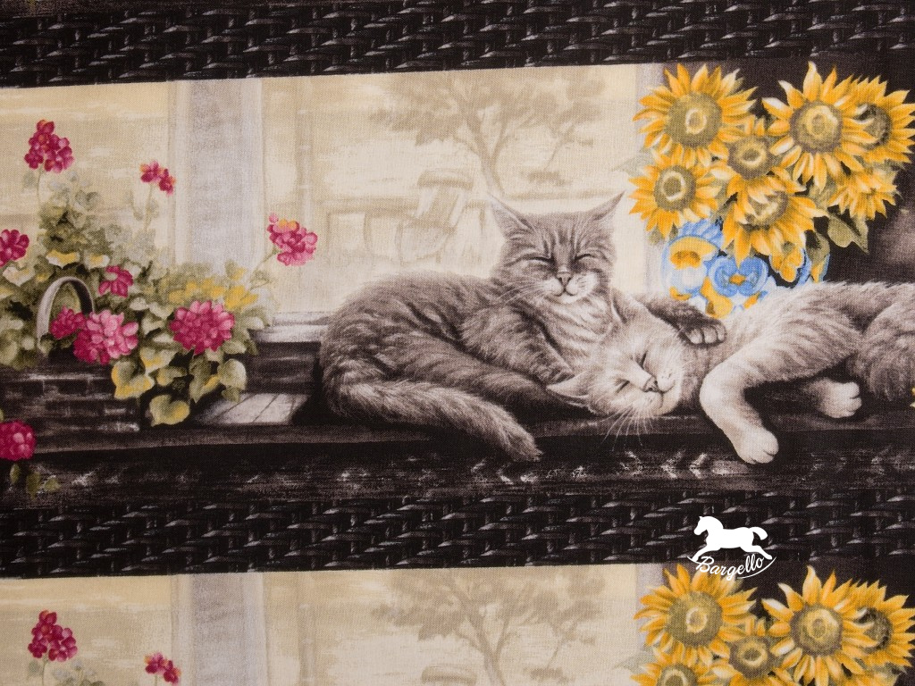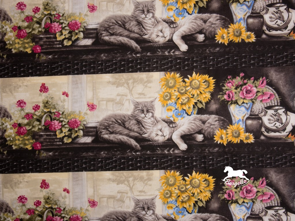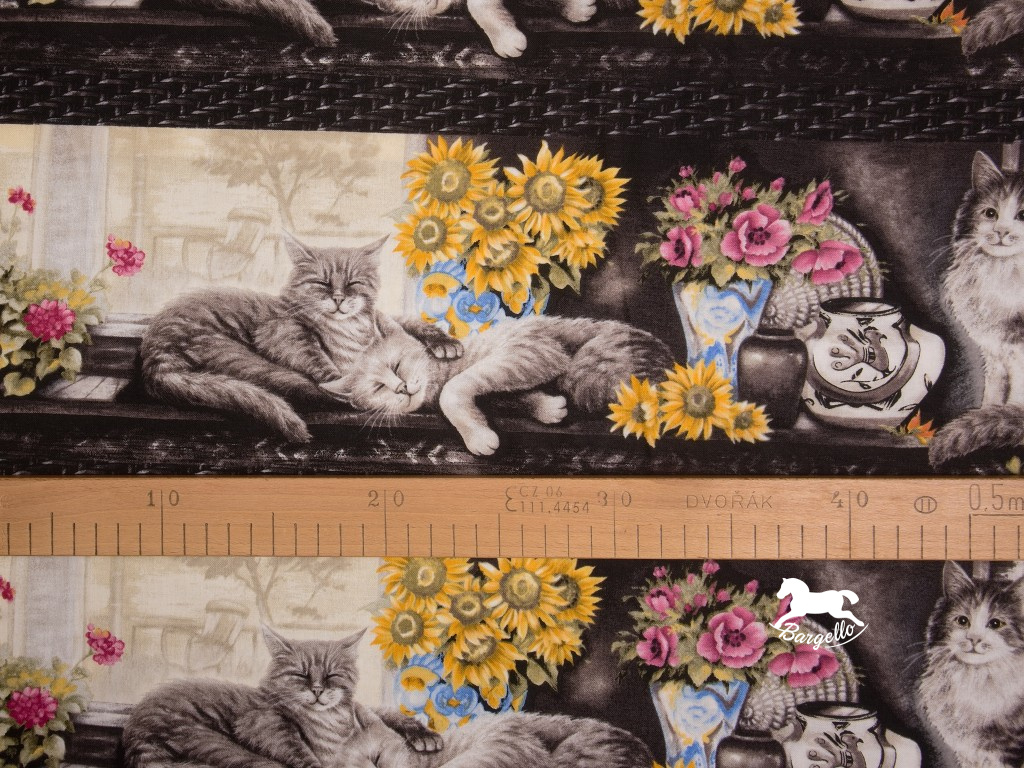 Tmavě šedá látka s kočkami a slunečnicemi, motiv se opakuje v pruzích. 100% bavlna. Čtverec o velikosti 50 x 55 cm.Doplňkové parametry