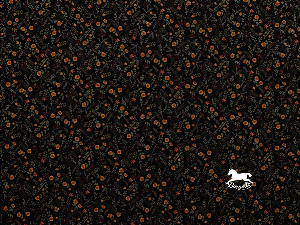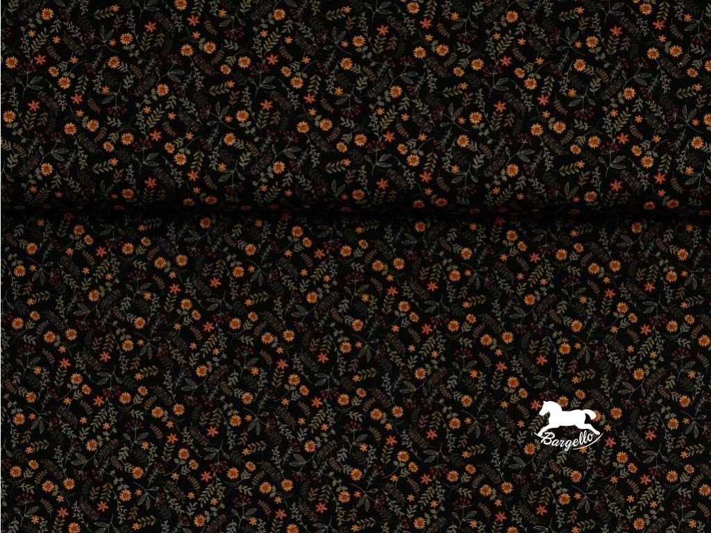 Čtvrtka z černé bavlněné látky s drobným kytičkovým vzorem z kolekce Cavalier Crows. Černý podklad je pokryt drobnými oranžovými kytičkami, červenými bobulemi a zelenými větvičkami. Fat Quarter o velikosti 50x55 cm je skvělou volbou pro drobné projekty.