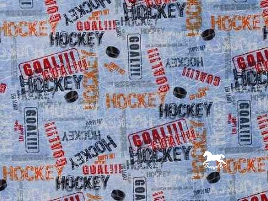Světle modrá látka s hokejovými nápisy, 100% bavlna. Čtverec o velikosti 50 x 55 cm.