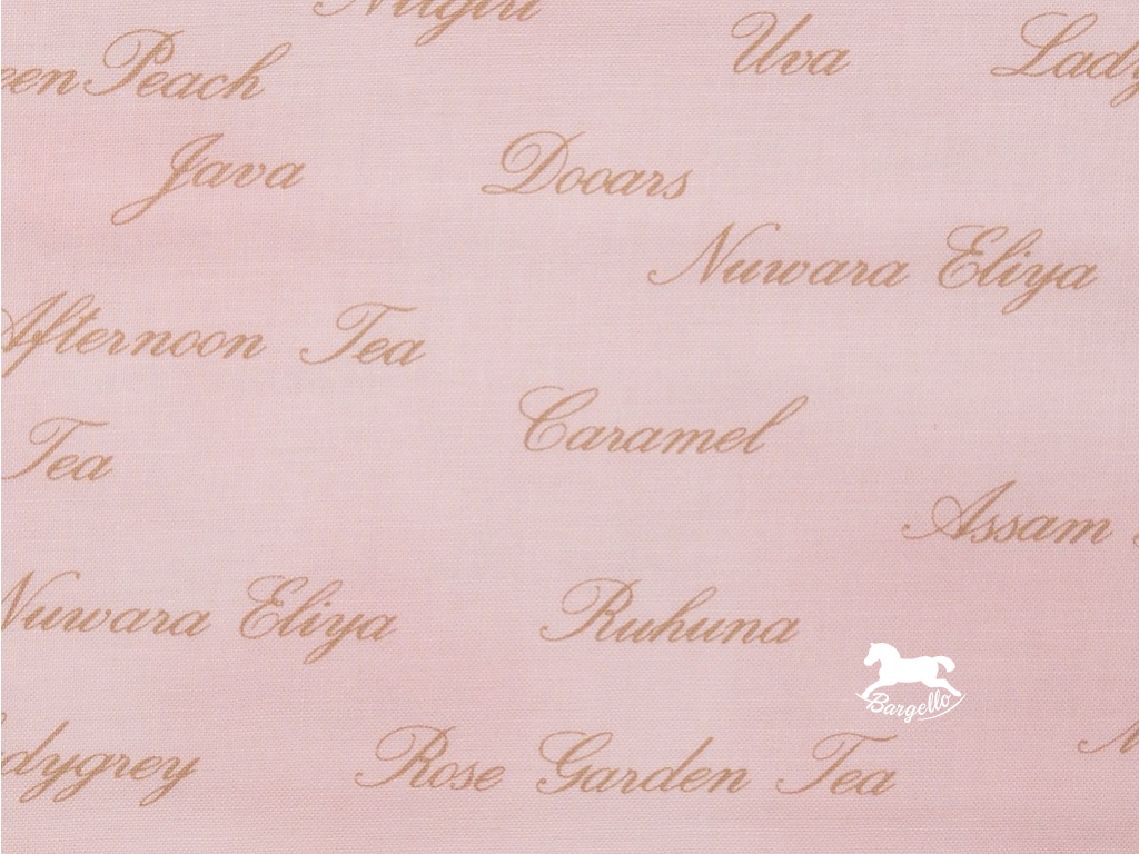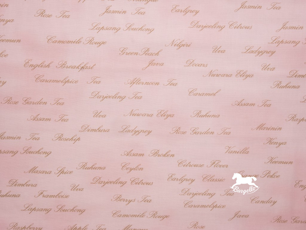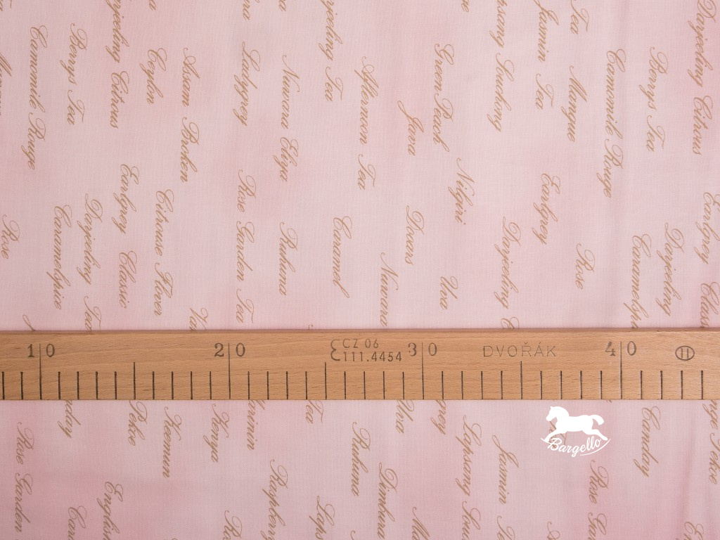 Růžová látka s hnědými nápisy.