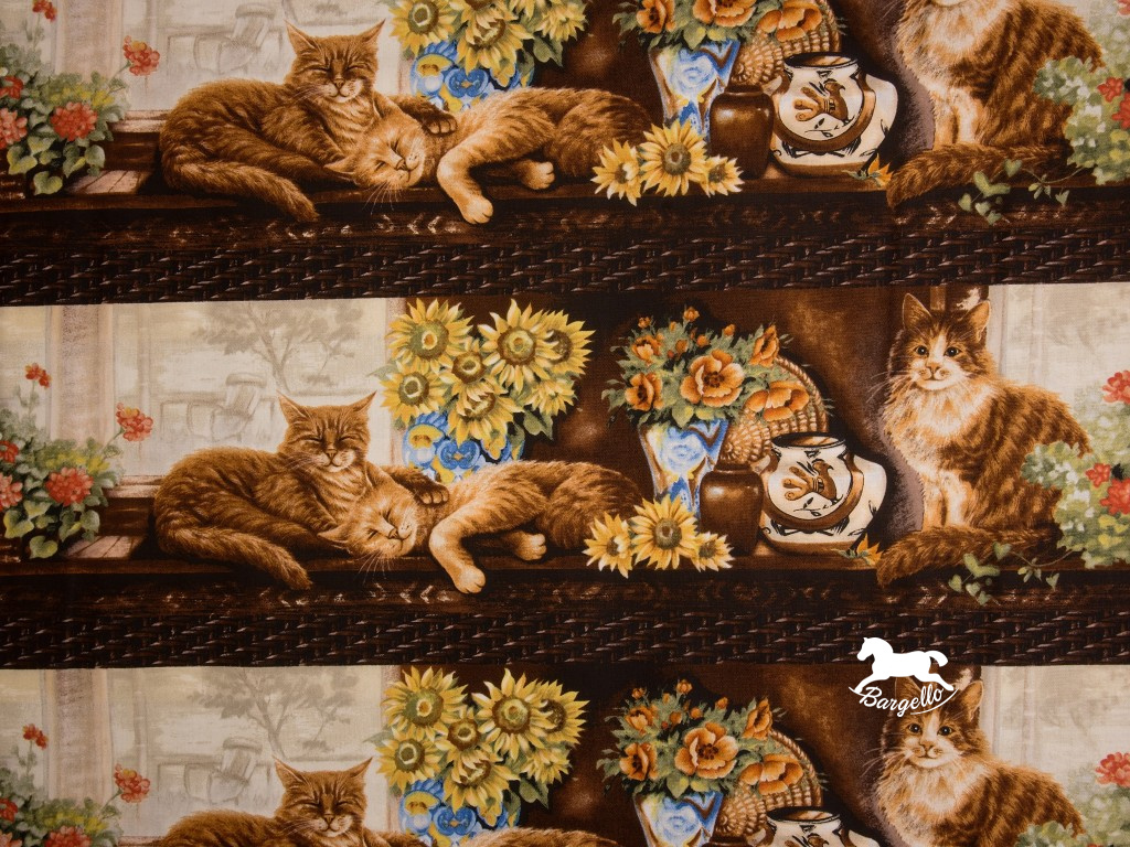 Hnědá látka s kočkami a slunečnicemi, motiv se opakuje v pruzích. 100 % bavlna, šíře 110 cm.Doplňkové parametry