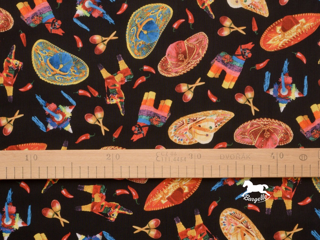 Černá látka s barevnými mexickými motivy klobouků, 100% bavlna, šíře 110 cm.Doplňkové parametry