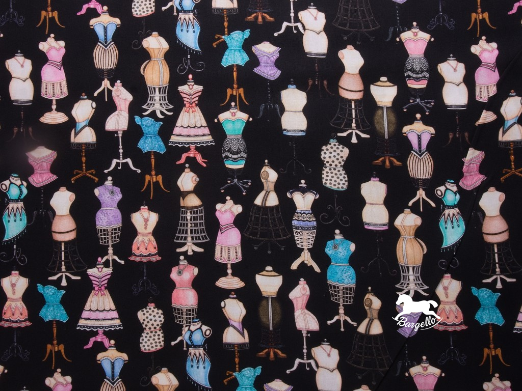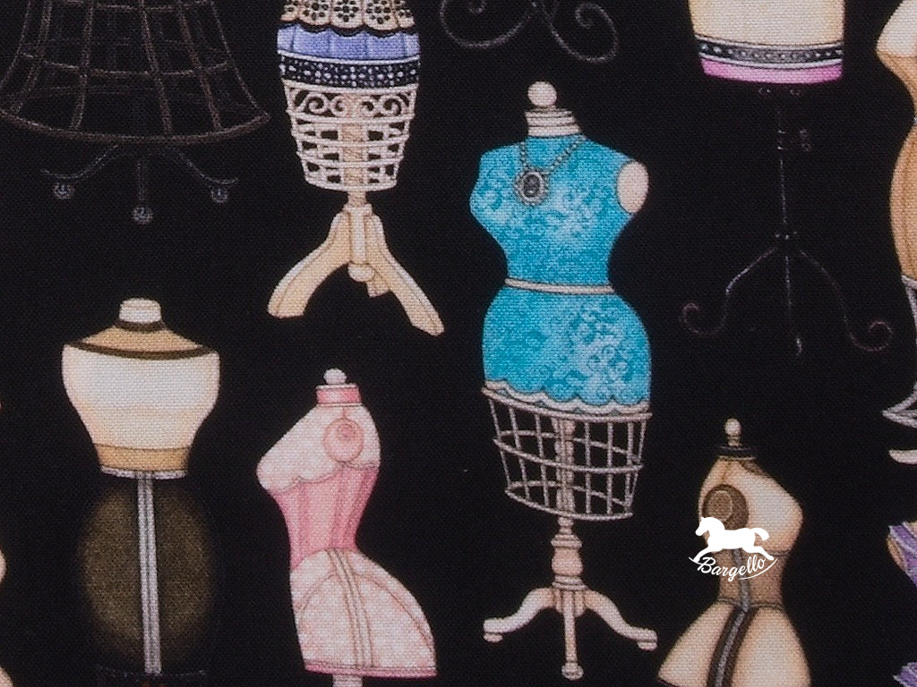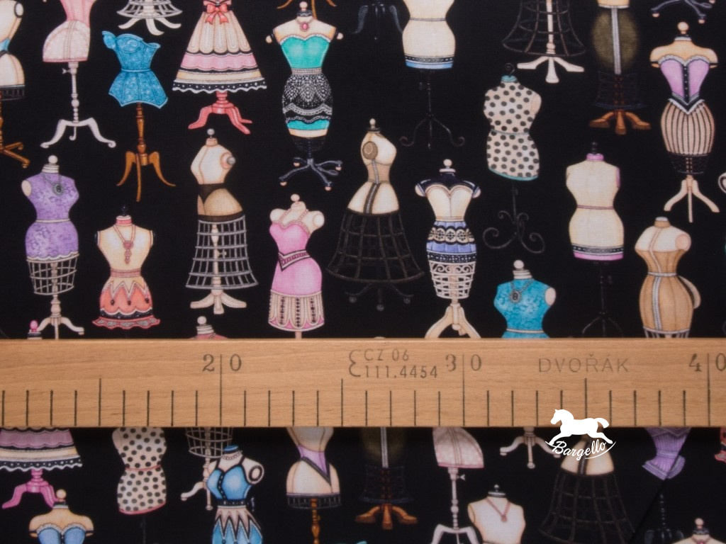 Bavlněná látka Tailor Made Dress Form Black od Quilting Treasures Fabrics s hravou kombinací kreativity a elegance. Na černém podkladu jsou výrazné motivy krejčovských panen, které měří cca 8 cm, a přinášejí do vašeho šití moderní nádech. Tato metráž je skvělou volbou pro šití oděvů, tašek a různých stylových doplňků.